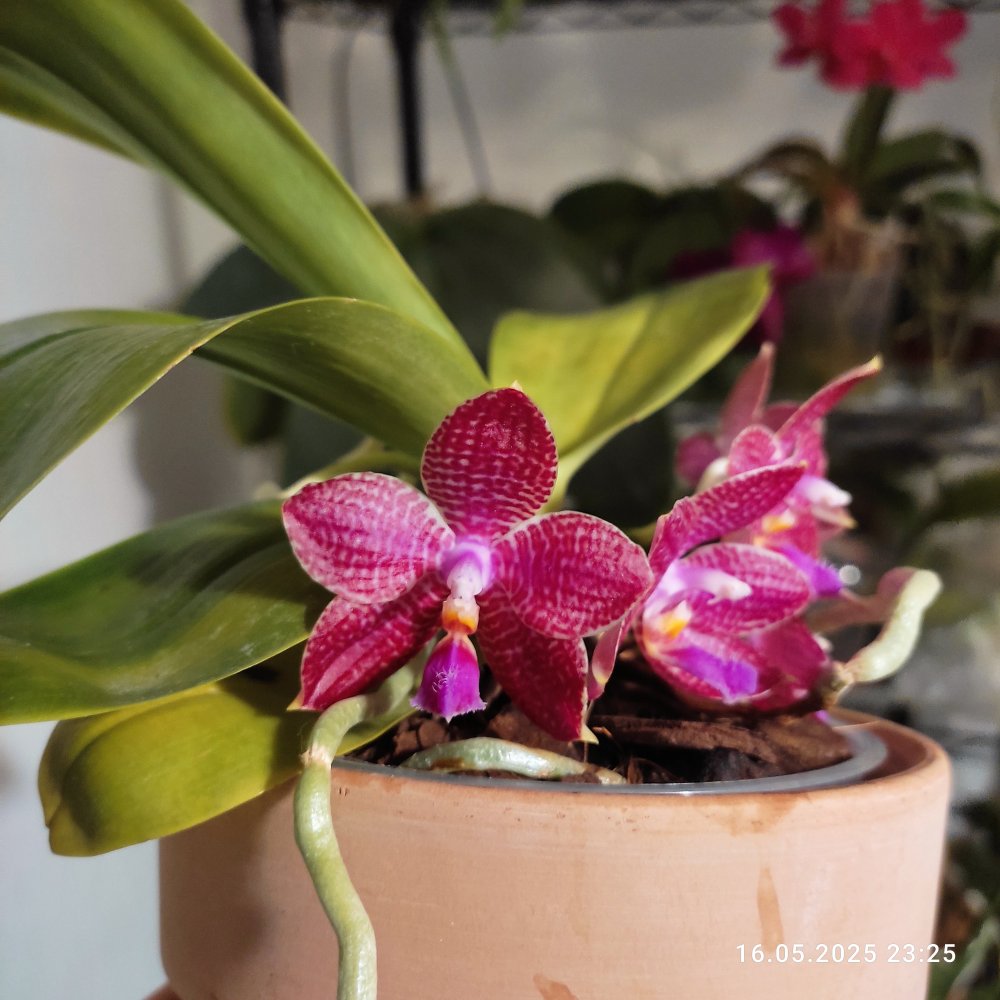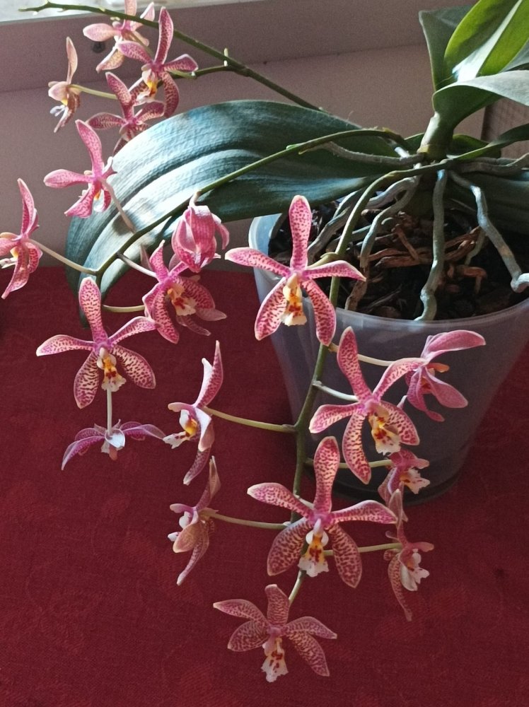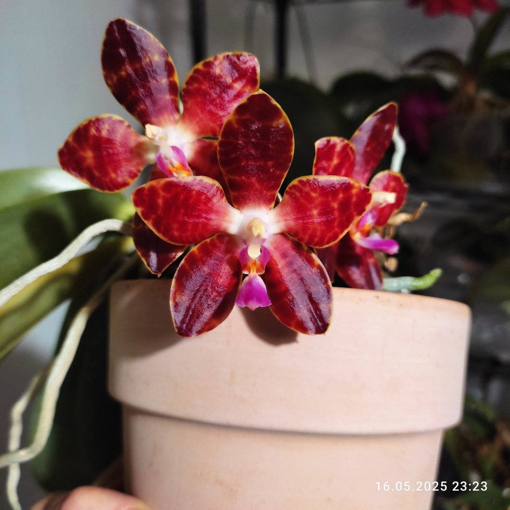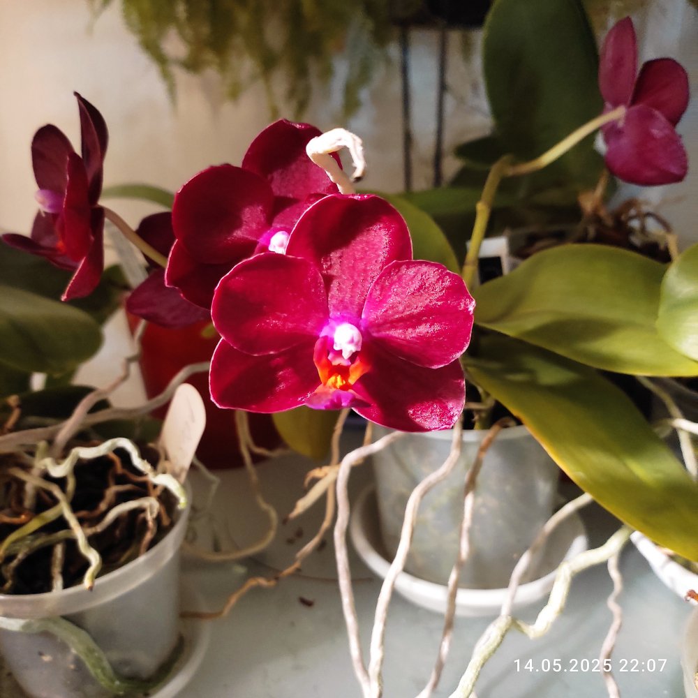 Phal. Allura Crimson Love,она такая есть насыщенно красная. Только мне показалась капризной, так как стоит недополить, отсушивает бутоны. Несколько цветоносов, если бы не отсушила несколько бутонов, то был бы букетик попышнее.