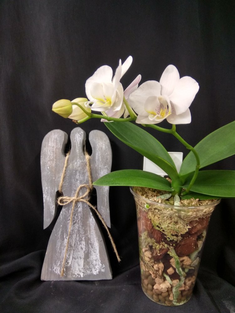 размер цветка 5см, высота от грунта до верхушки цветоноса 17см, размах листьев 20см.