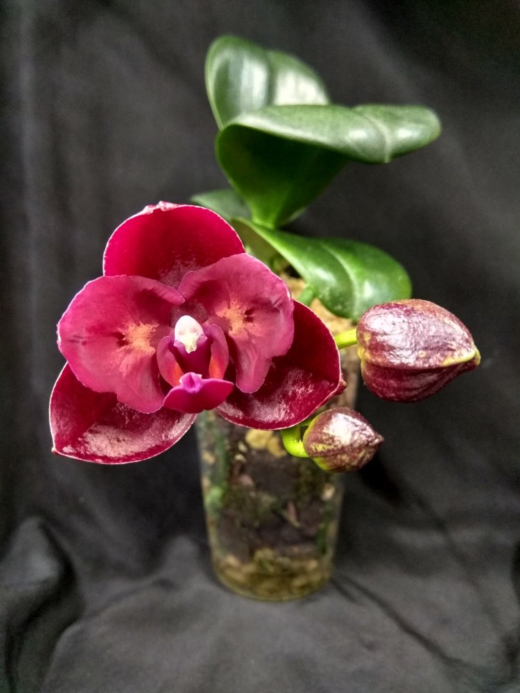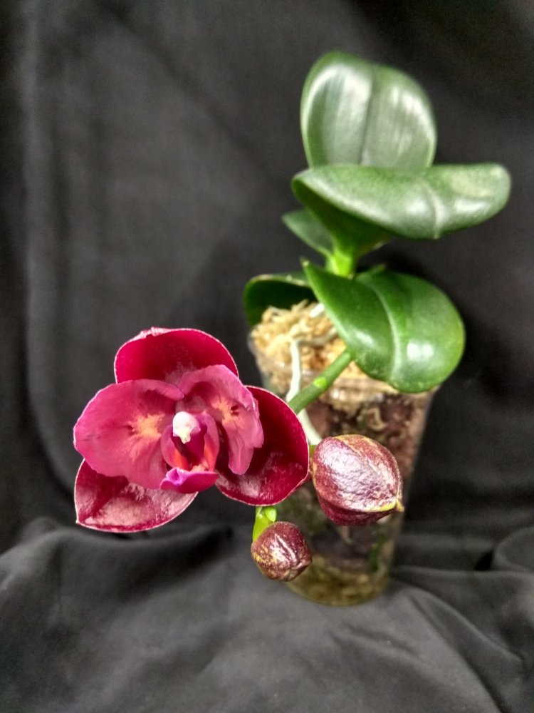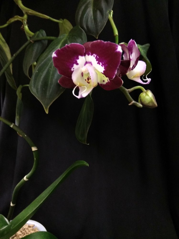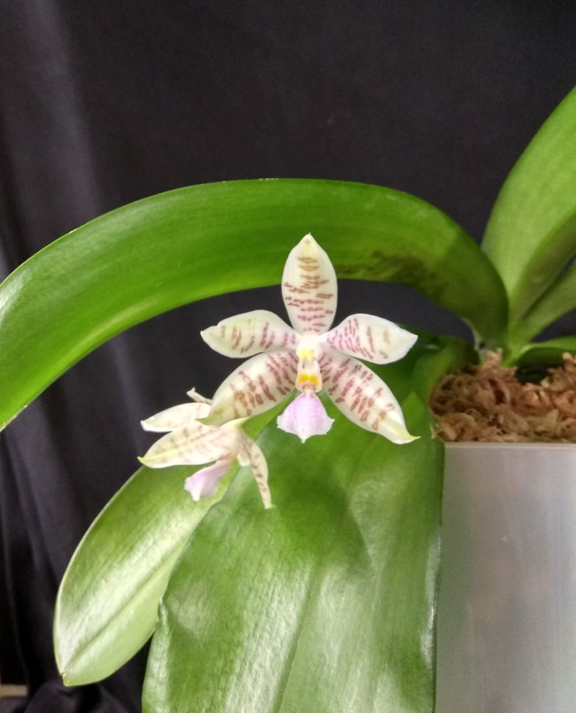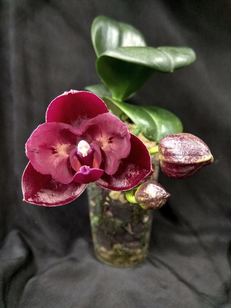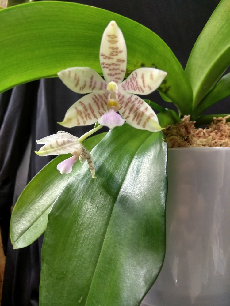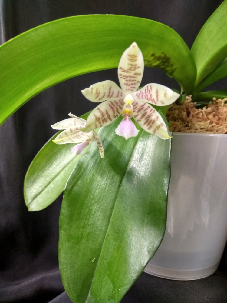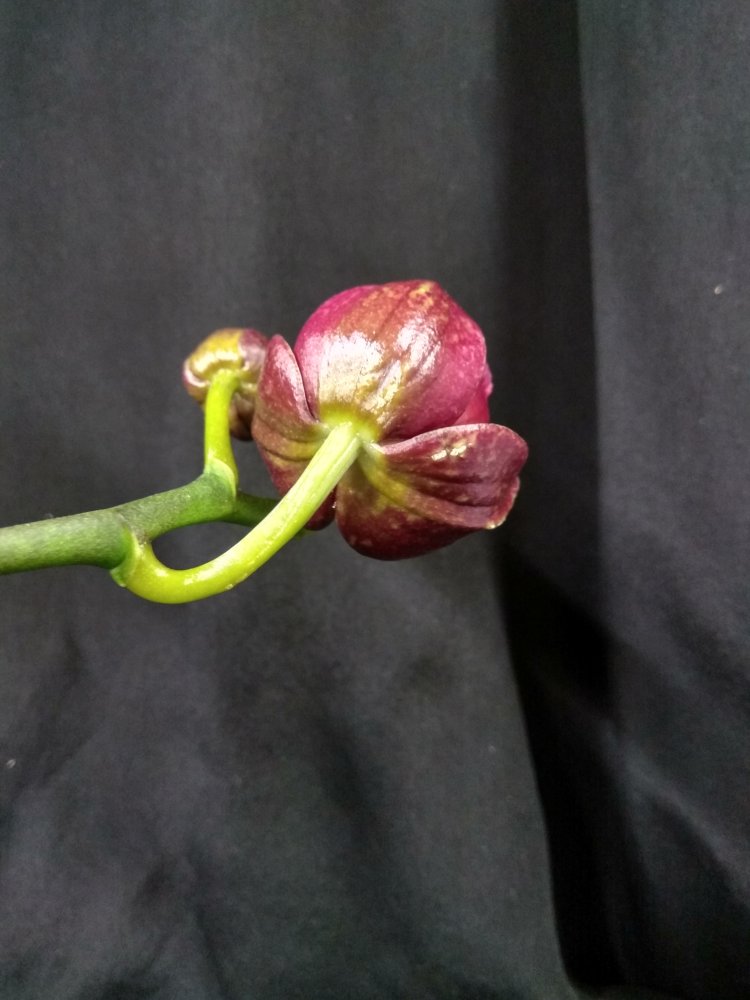 Темненький отдохнул, отрастил 2-й цветонос и пошёл на 2-й круг. В этот раз обещает цветение с 2-х цветоносов: раскрыл цветок на старом йветоносе и параллельно дует бутоны на новом.