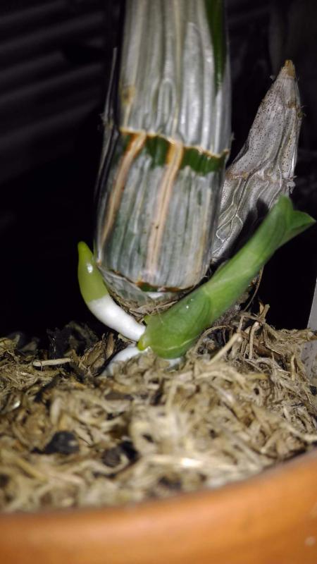 будете сажать, не заглубляйте нижний рост. если нормально растет и верхний, я бы при посадке материнскую бульбу посадила под наклоном, чтобы верхнему росту проще было в субстрат укорениться