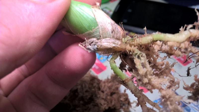 Виталий Р, это,как я понимаю,ДО удаления гнилой бульбочки.Можно подсушить часик и посадить.НО место среза не заглубляйте! Лучше пусть и ризома и верхняя часть корешков будет над субстратом.И не опрыскивайте и не поливайте дня 3-4.