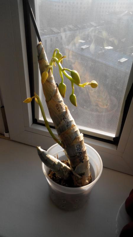 И самое главное, что меня сейчас беспокоит, это решить, вытаскивать его из мха или нет. Может оно сгнить или нет. Потому что растение пришло жутко залитым, такое ощущение, что пол литра воды в него плеснули. Я с морковками дело не имела, но почему-то логика мне подсказывает, что для орхидей это не есть хорошо, когда они такие мокрые...Тем более, при температурах около 0. Два человека в отзывах написали, что тут же освободили морковки из мха, в котором пришло растение. А другие ничего не написали. Я вообще против того, чтобы сразу вытаскивать новоприбывших из привычного им субстрата. По-моему им так тяжелее адаптироваться. Но если вопрос стоит о жизни и смерти растения, то тут, конечно же, не приходится выбирать ((( Тем более, мне кажется, что ювенильная бульба не была желтой, в первый вечер, когда я ее получила...Хотя, не исключено, что я этого просто не заметила из-за плохого освещения.