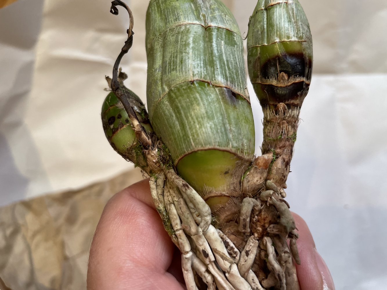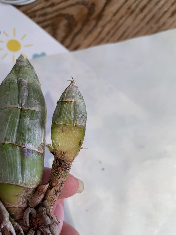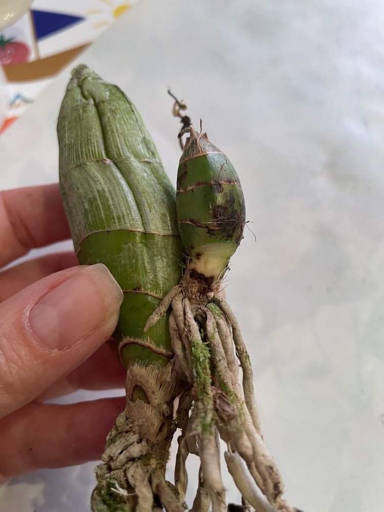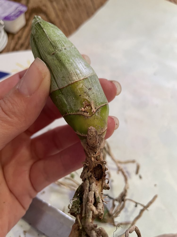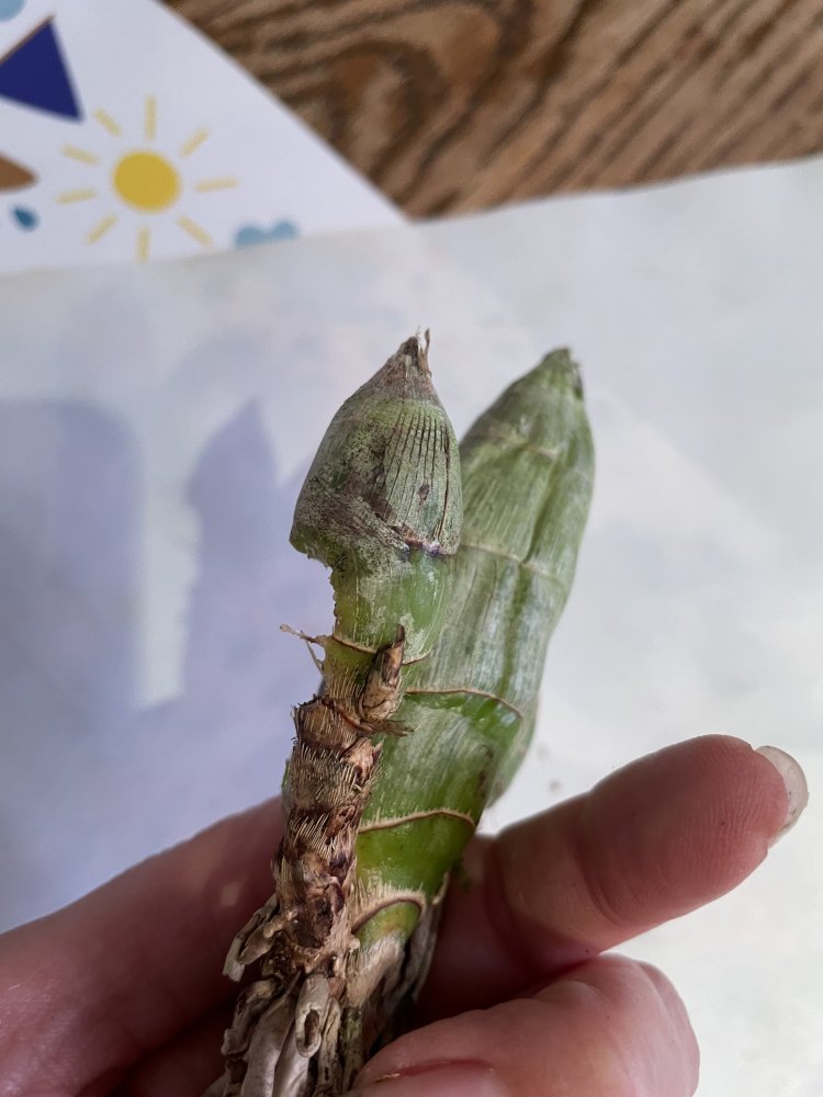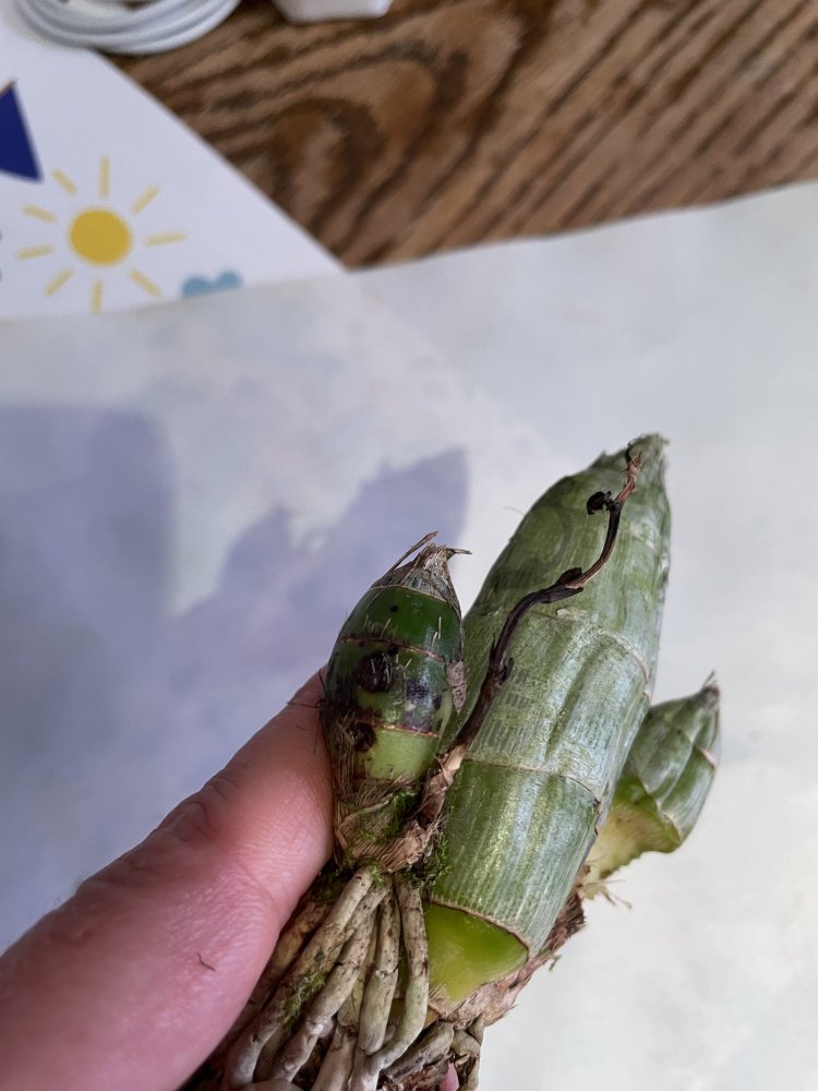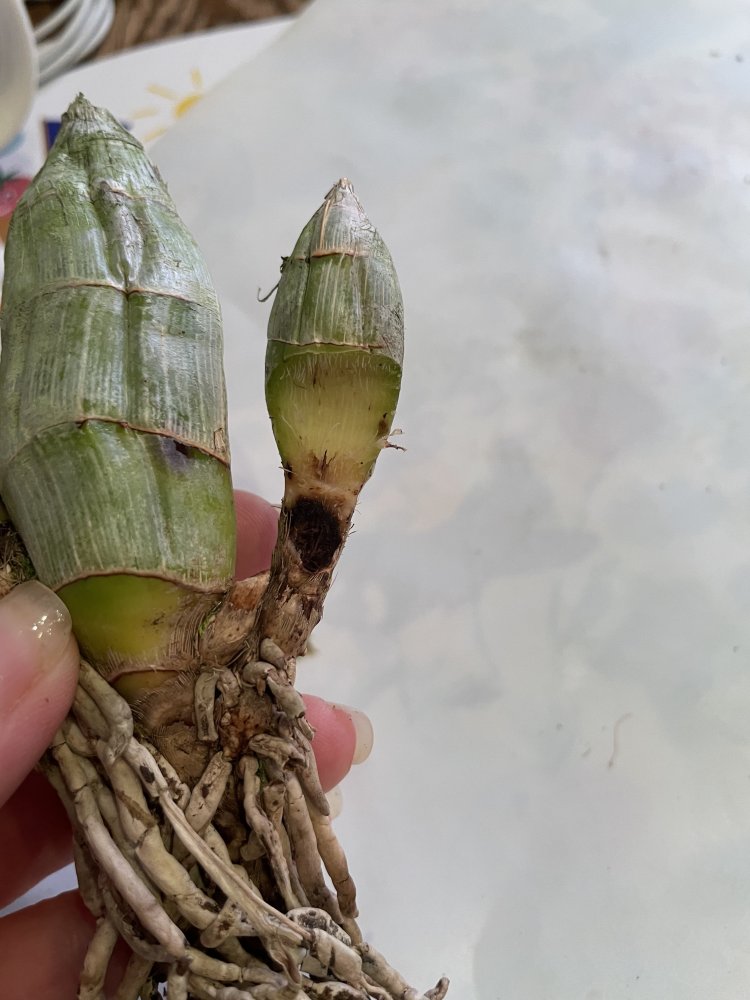 Вот так получилось(@julesja, я бы такую совсем убрала, пятно у самой ризомы- может на крупную бульбу перейти. Крупная отличная, еще рост даст. Зеленка тут может не помочь, пятно уже мягкое - там гниль внутри. Тут только вырезать, полностью или частично. Если частично - тоже смвсл сомнительный, она рост вряд ли даст, а толку от неев плане запасов веществ с гулькин нос даже без вырезания. Только оставлять источник инфекции.