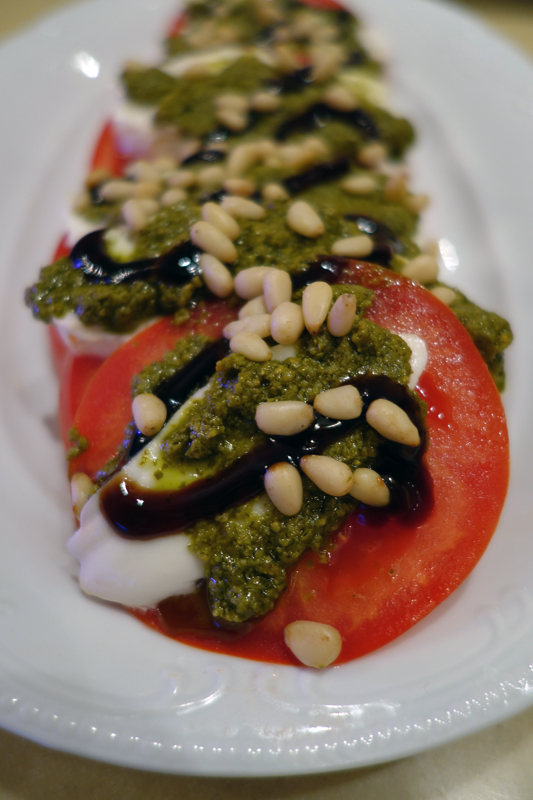 Порезать помидоры и моцареллу тонкими ломтиками. Выложить на тарелку, чередуя. Сверху песто, немного полить бальзамико и добавить кедровые орешки.