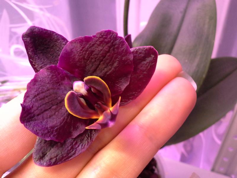 особенно шестой лепесток на колонке, до обеда орхидея нежно пахнет гиацинтом, а розоватый оттенок появился на краях после 2-х недельного цветения. Листья вытянутой формы, снизу красноватые, крап отсутствует.Растение молодое, диаметр цветка 4см.