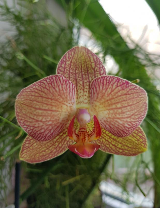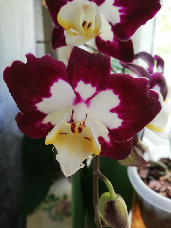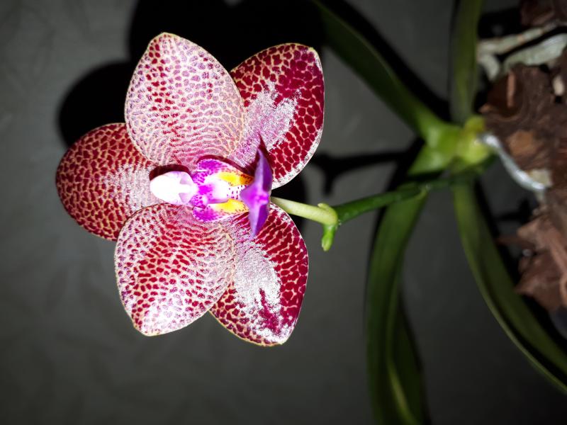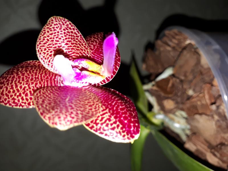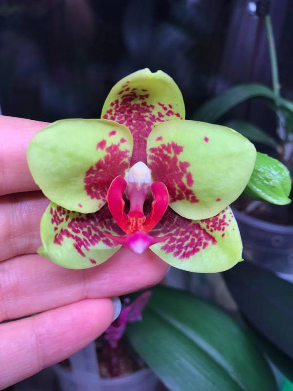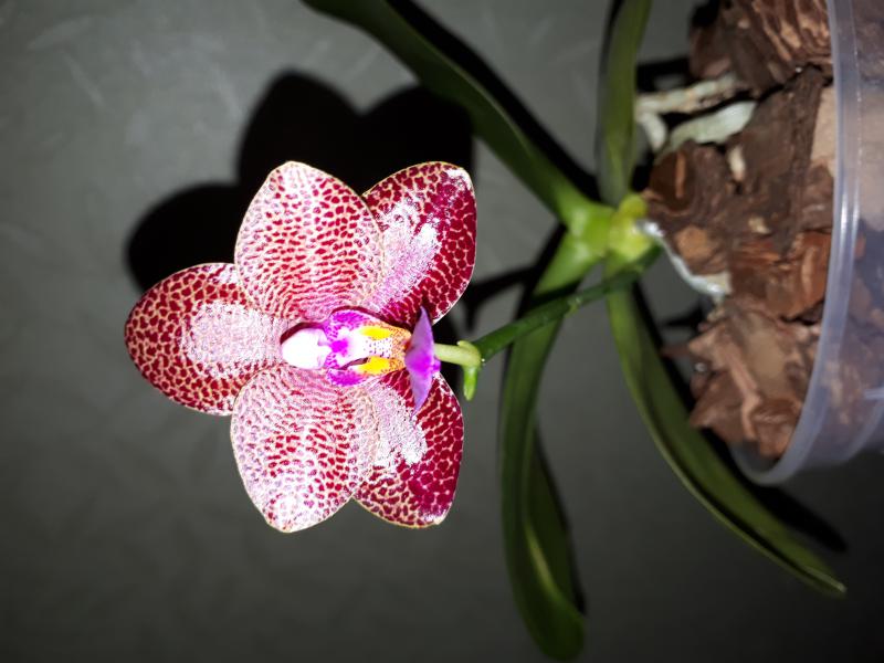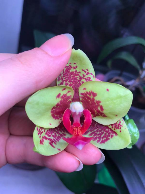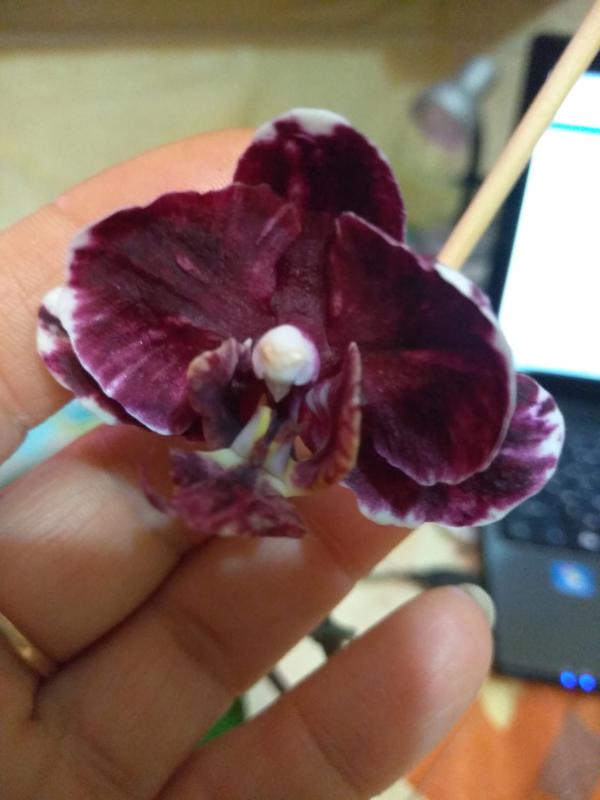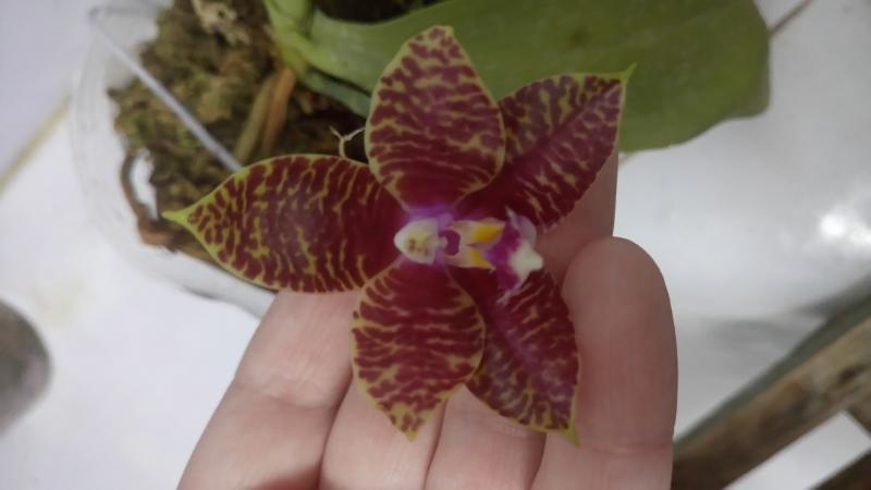 Всем доброго времени суток. Помогите опознать. На бирке -просто phal. mituo sun. И все. Без mituo#1. Сегодня распустился цветок.Вроде похож на mituo#1, но мне кажется естт и отличия. Во- первых отличие в форме самого цветка- у mituo#1-он кругленький, а у моего нет идеально круглой формы. Во- вторых форма петалий.У mituo #1 они плавно скругленные и их концы ориентированны горизонтально, у моего более вытянутые и кончикт приподняты вверх. И в- третих отличие в окраске внутренних маленьких лепестков между губой и колонкой. У mituo#1они переходят от ярко- алого в темный, а у моего они желтые с переходом в фиолетовый , с такими же крапинками. Сама губа тоже фиолетовая до середины, а дальше преобладает коричневатый оттенок. Что это за зверь может кто подскажет? Или это потому, что цветение первое?