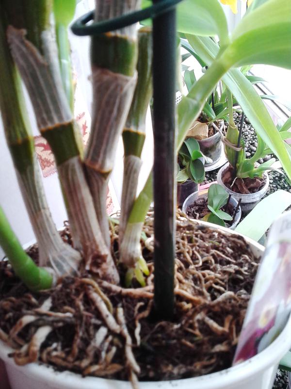 Всем привет! Очень нужен совет... Осенью мне пришли дендрофалы из култаны в нормальном состоянии, один даже очень скромно процвел, я их рассадила по горшочкам, не снимая с кокосовых блоков, потом дендрофалики стали как-то хиреть и выглядели вяло... У меня был уже печальный опыт умертвления дендров, поэтому я махнула рукой, воткнула их всех (4 штуки) в один горшок и оставила в покое, даже не надеясь на лучшее... Но постепенно дендрофалики стали стали выпускать хорошенькие зеленые корни, каждый куст дал по 1-2 роста, сейчас 3 роста уже размером со старые бульбы, один средненький рост, а один совсем маленький, но растет потихоньку...