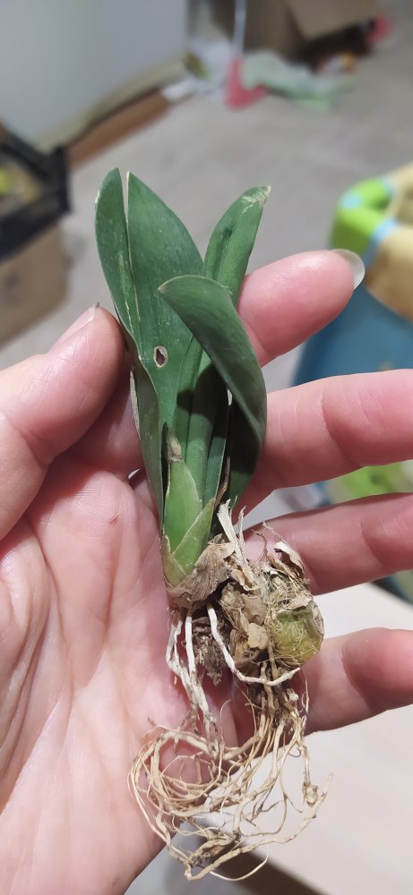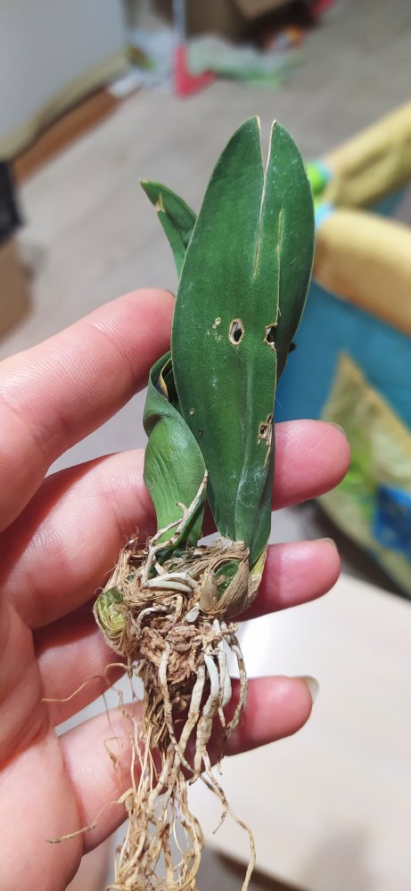 @Leksevna, здравствуйте! Промойте аккуратно под струёй теплой воды под краном листики, бульбы и корни. Новый рост мочить нельзя, срззу загниет! Затем приготовьте раствор из 1 чайной ложки сахара, 2 капли Эпина и стакана воды. Этим раствором протрите листья и бульбы, также не попадая на новый рост. Затем оставьте на дне любой посуды раствор и поставьте в него растение так, чтобы в воде были только остатки корней, верхняя часть ризомы и новый рост - на воздухе. Оставьте так на несколько часов, пусть пьет. Затем можно будет посадить.