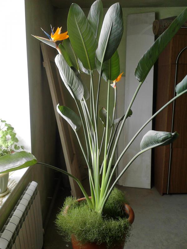 Посадила я как-то семена стрелиции (примерно в 2007г). Они дружно проросли и были подарены маме. У меня цветы ассоциируются с жар-птицей. За погром на заднем плане извините, ремонт, комната нежилая.