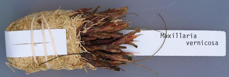Maxillaria Vernicosa пришла полностью сухая, ни одной бульбы живой нет, к сожалению. Весит вместе со мхом и шильдиком 6 грамм. Судя по состоянию, высохла не менее месяца назад.