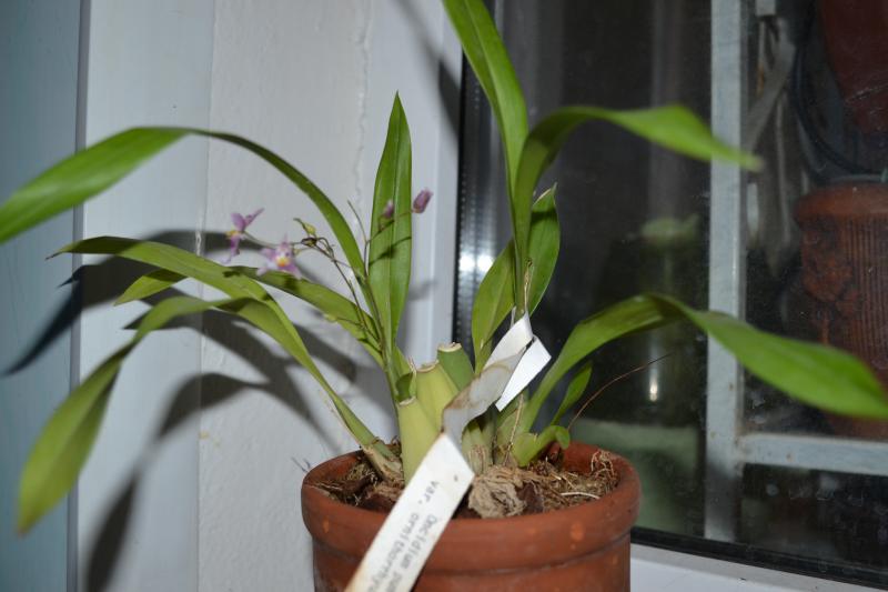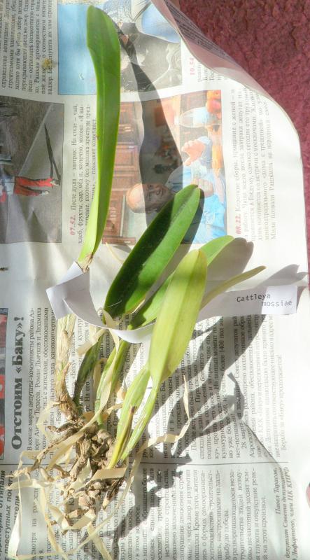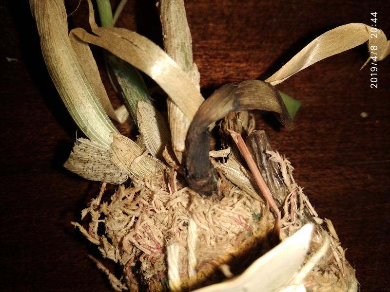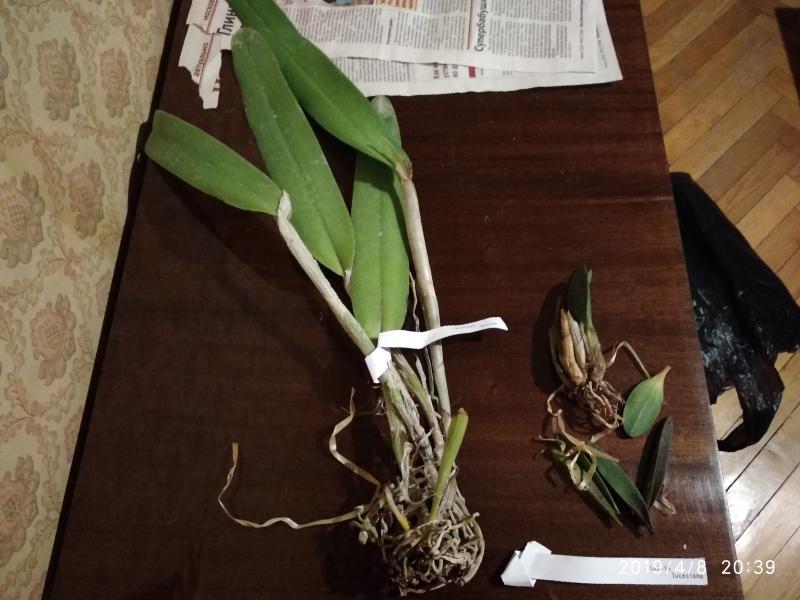 COELOGYNE cristata - отрезанная деленка без корней, на вид вполне живая, два молодых роста удалила - один сломан и высох, другой пожелтел. Буду пытаться вырастить корни у двух оставшихся молодых ростов.