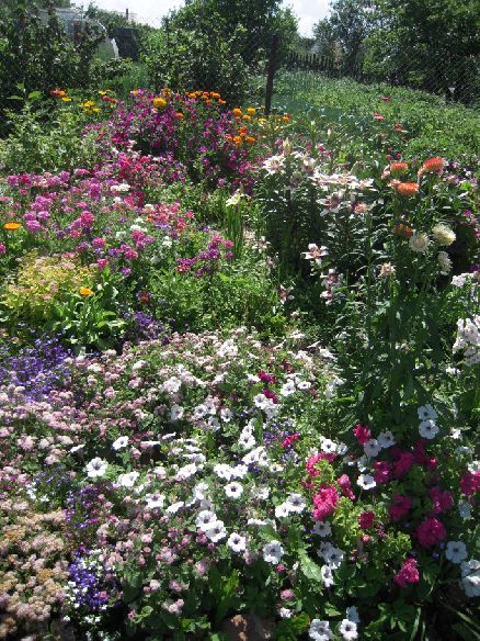 Буйство красок. Тут и петуния, и лилии и астры и календула. Насколько я могу видеть процентов 90 это семенные цветы (т.е. из семян). Немного хаотично, пестро но для деревенского дизайна (в смысле сельский стиль) по моему отличное решение. Вот чем бы вы разбавили? Мне кажется надо какой то "раздел" установить, может декоративнолиственные, чтобы немного убрать беспорядочность но оставить легкий хаос, ведь в нем то и прелесть.