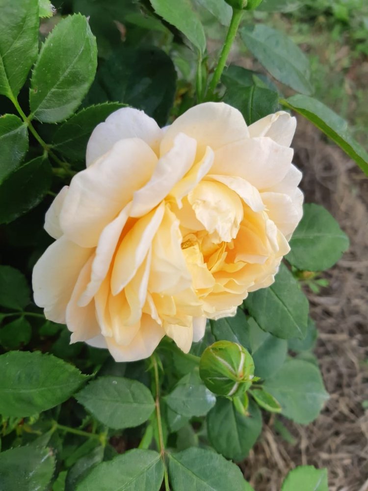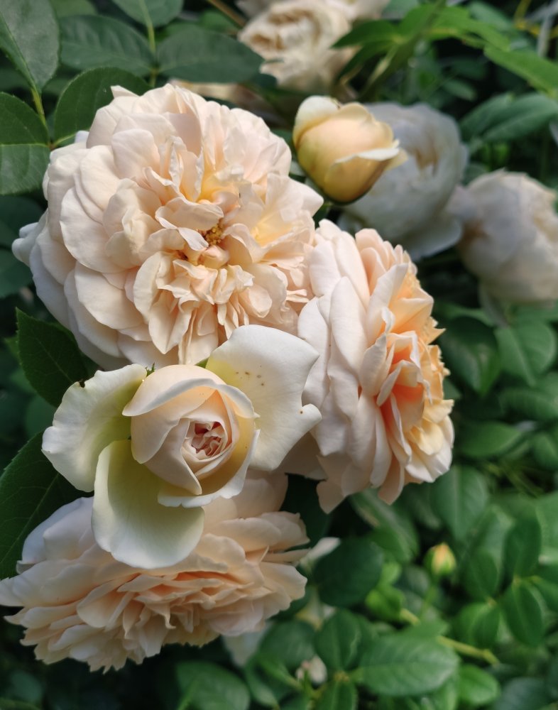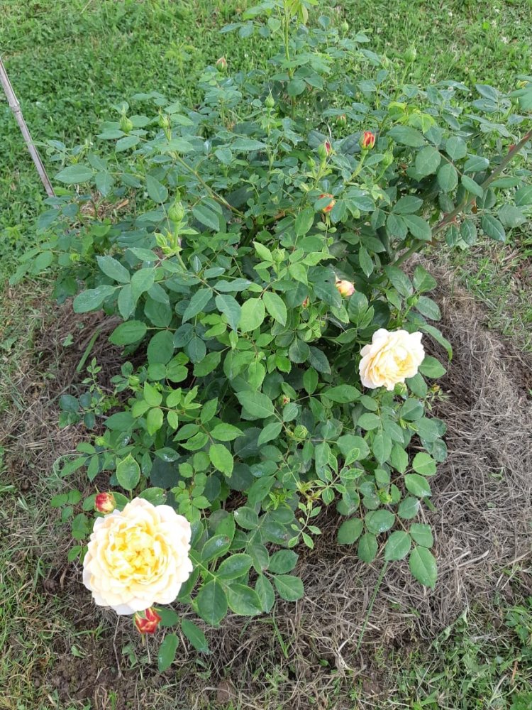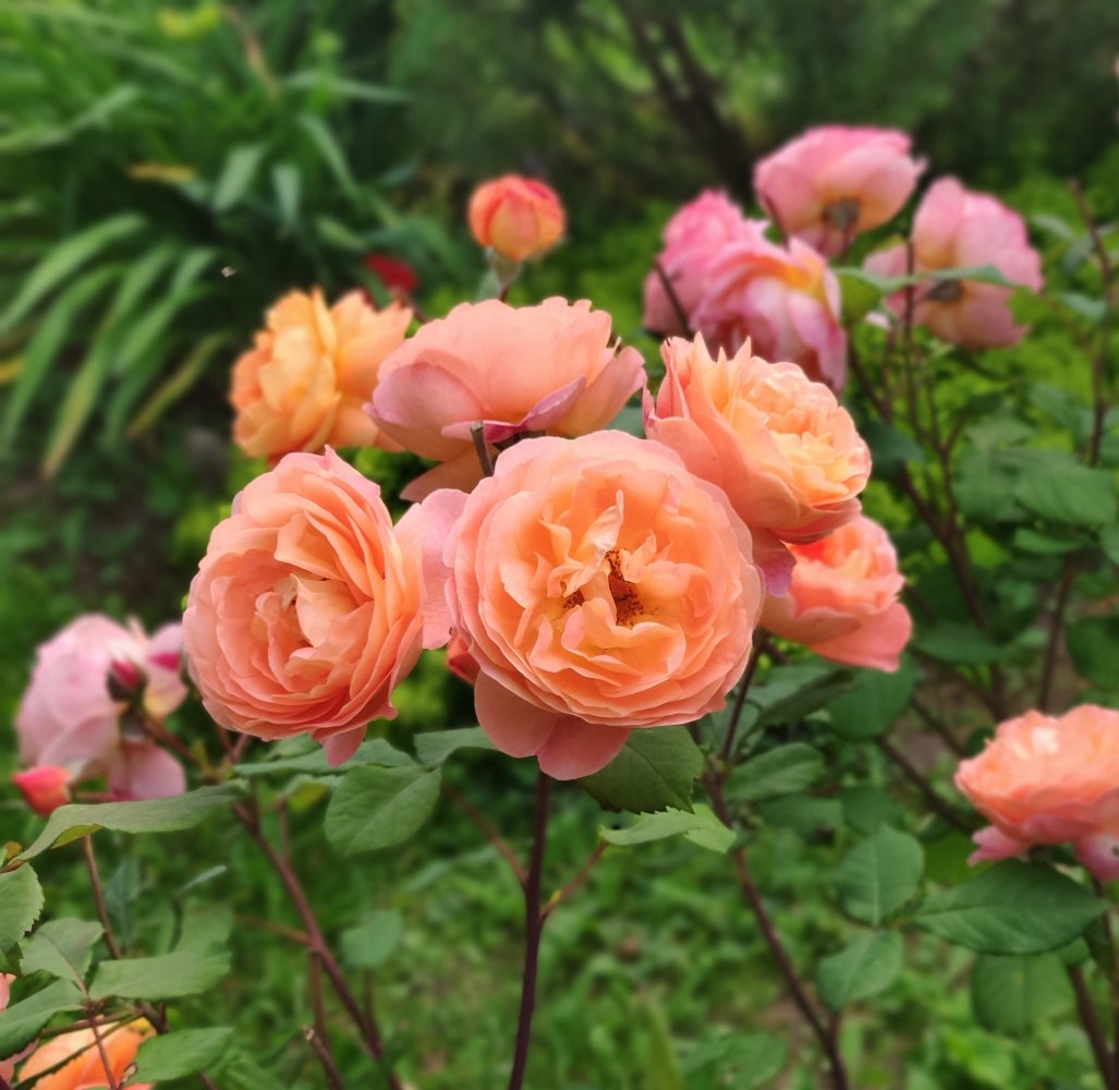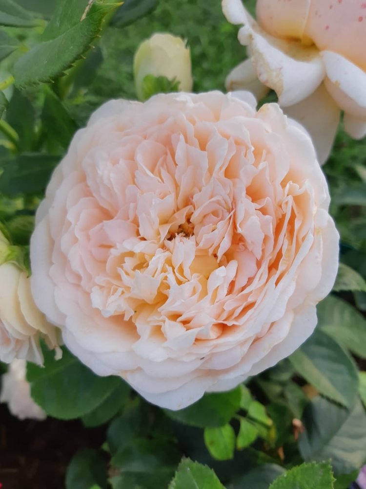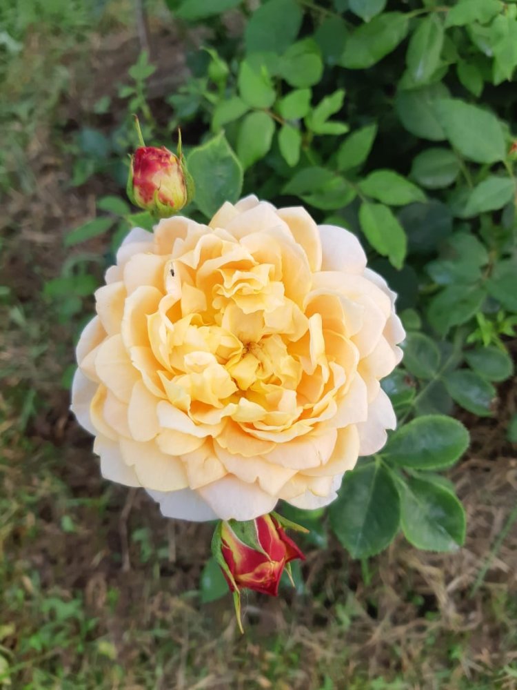 И напоследок "ложка дегтя")). Хотела в этот сезон посадить Голден Селебрейшн, но в заказах не успела ее приобрести. В июне в одном садовом центре увидела прекрасные саженцы в горшках - отменного качества, не дорогие. Долго думала, знала, что вероятность получить именно этот сорт минимальная, но все же не удержалась. Купила и посадила 2 шт рядом. Сейчас просто чудеснейший кустик вырос - мелколистный, с кучей тонких побегов, шарообразной формы сам куст. И вот начал цвести. Конечно, чуда не случилось, это не Голден Селебрейшн. Да, красивые цветы, очень ароматные. Оставлю. Очень похож на какой то сорт Остина, но сама в них не очень разбираюсь, поэтому кто его сможет опознать, напишите, пожалуйста, варианты названий сорта. Бутоны оранжево-красные, цветы прямостоячие, не поникают. Крупные, ароматные, кремово-абрикосового цвета.