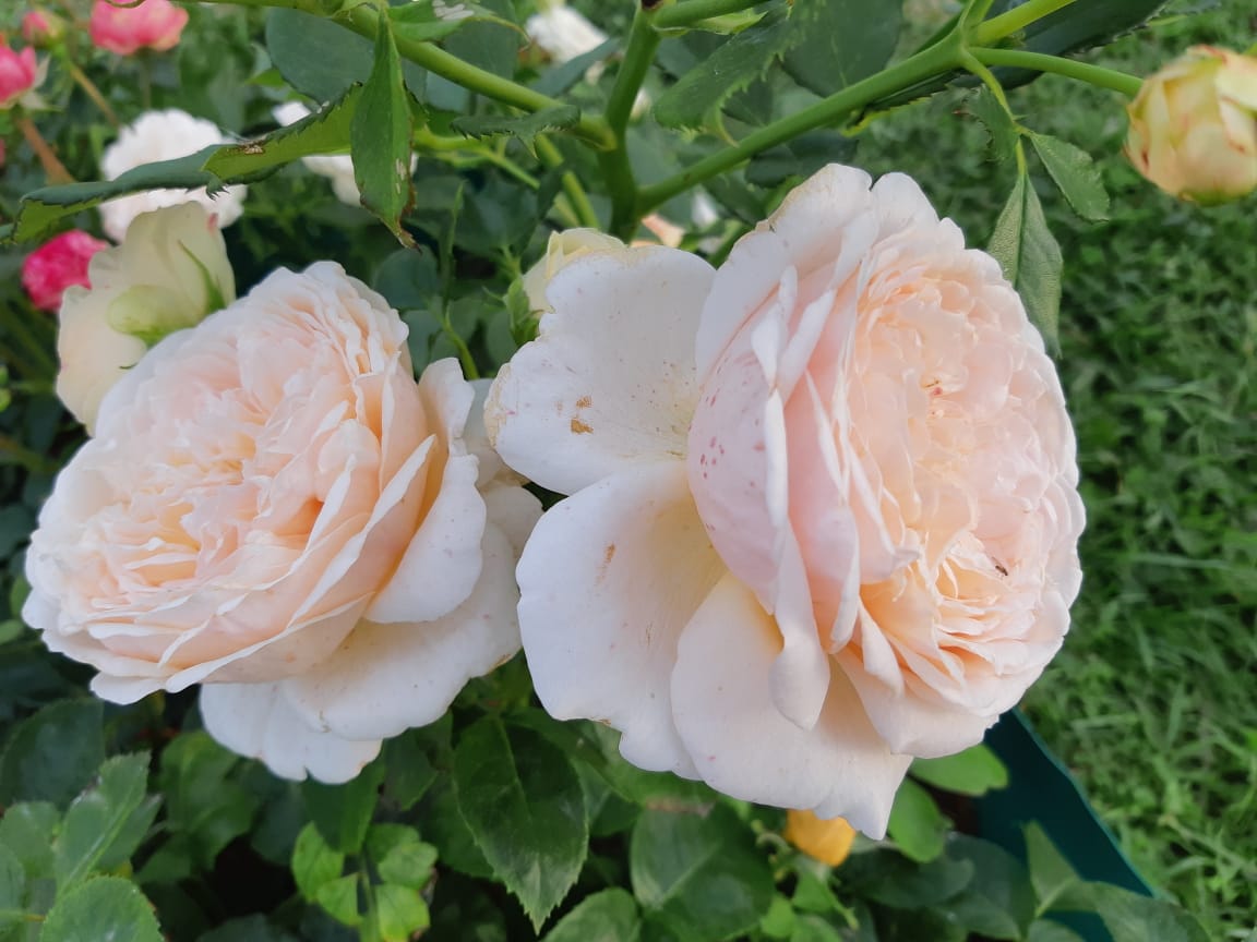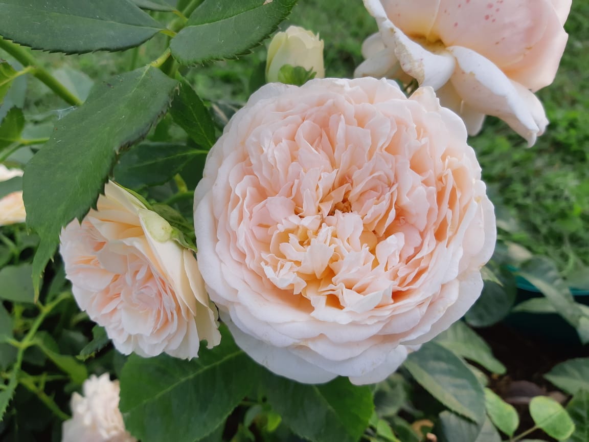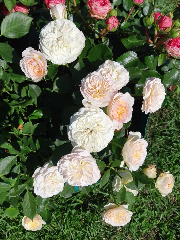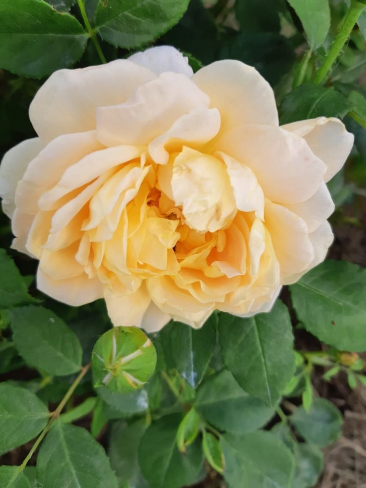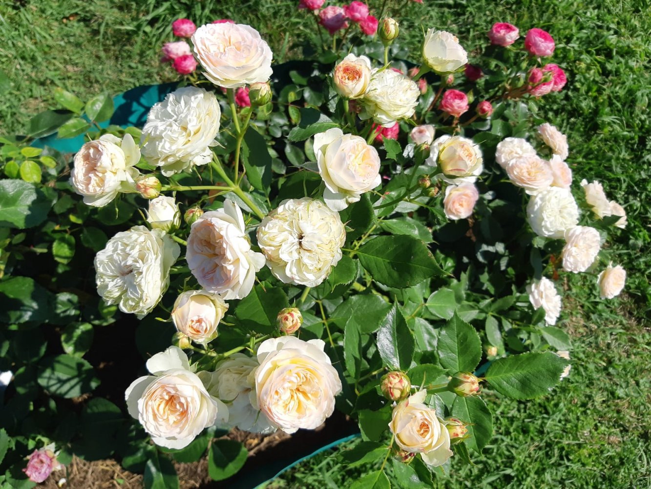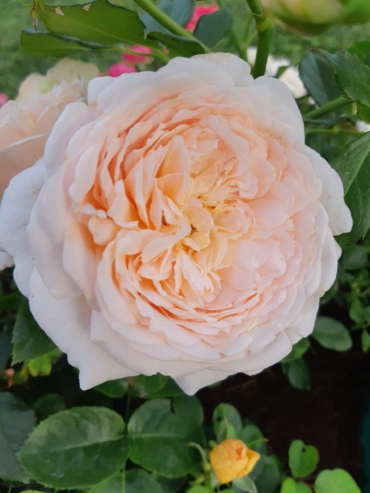 И напоследок "ложка дегтя")). Хотела в этот сезон посадить Голден Селебрейшн, но в заказах не успела ее приобрести. В июне в одном садовом центре увидела прекрасные саженцы в горшках - отменного качества, не дорогие. Долго думала, знала, что вероятность получить именно этот сорт минимальная, но все же не удержалась. Купила и посадила 2 шт рядом. Сейчас просто чудеснейший кустик вырос - мелколистный, с кучей тонких побегов, шарообразной формы сам куст. И вот начал цвести. Конечно, чуда не случилось, это не Голден Селебрейшн. Да, красивые цветы, очень ароматные. Оставлю. Очень похож на какой то сорт Остина, но сама в них не очень разбираюсь, поэтому кто его сможет опознать, напишите, пожалуйста, варианты названий сорта. Бутоны оранжево-красные, цветы прямостоячие, не поникают. Крупные, ароматные, кремово-абрикосового цвета.