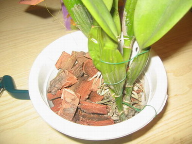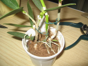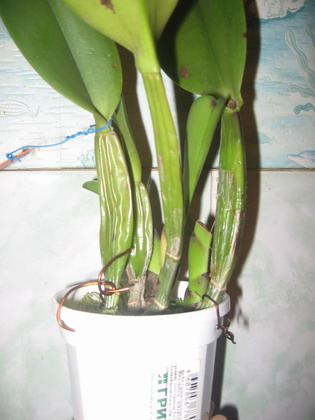 Каттлея попалась строптивая, проволоки ушло немало. Теперь она закреплена так, что не изменит своего положения, даже если горшок упадет. Проволоку можно будет убрать в будущем.