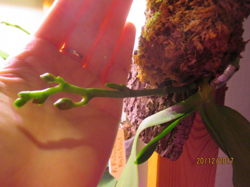 Выдал цветонос Phal. Mituo Diamond Panda, купленный у Снежаны из остатков в 2016 году. Очень неприхотливый, с бубнами вокруг него не скакала :)