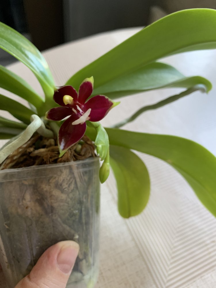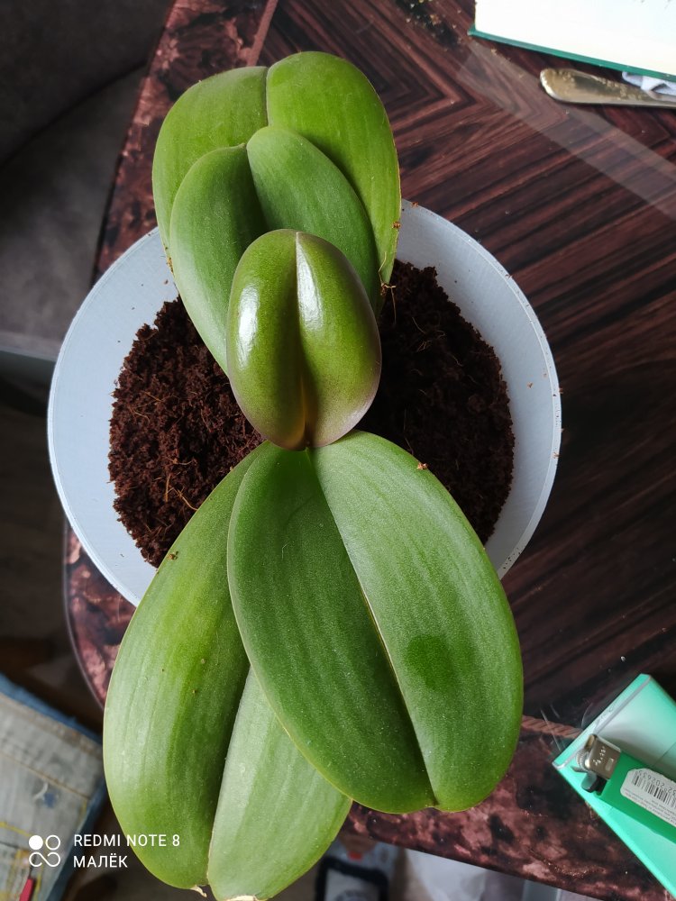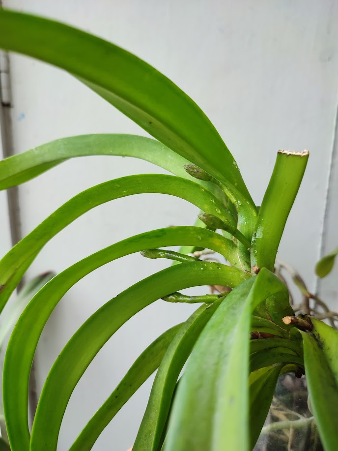 А Vanda Hiroshima Choice (Neofinetia falcata x Aerides flabellata) регулярно, без капризов, второе лето подряд, 4 цветоноса (красными стрелками, самая левая указывает на два цветоноса)