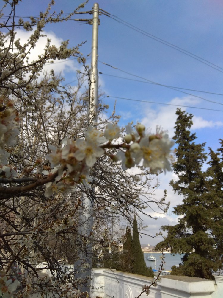 Весенний Севастополь. Чуть больше недели назад был гололед, шел снег и ветер дул пронизывающий! А сейчас цветут деревья, цветы, отцвели подснежники (все- таки нашла парочку в тенечке). Чайки прилетели и расположились рядышком на фотосессию. Есть у нас и парусник- не "Крузенштерн", конечно,- "Херсонес". Как-то увидела его выходящим из бухты- закат солнца, парусник идет под всеми парусами! Зрелище завораживало! Жаль, что у меня в тот момент не было камеры... Все, кто были в тот вечер на Приморском бульваре, получили огромное наслаждение!!!