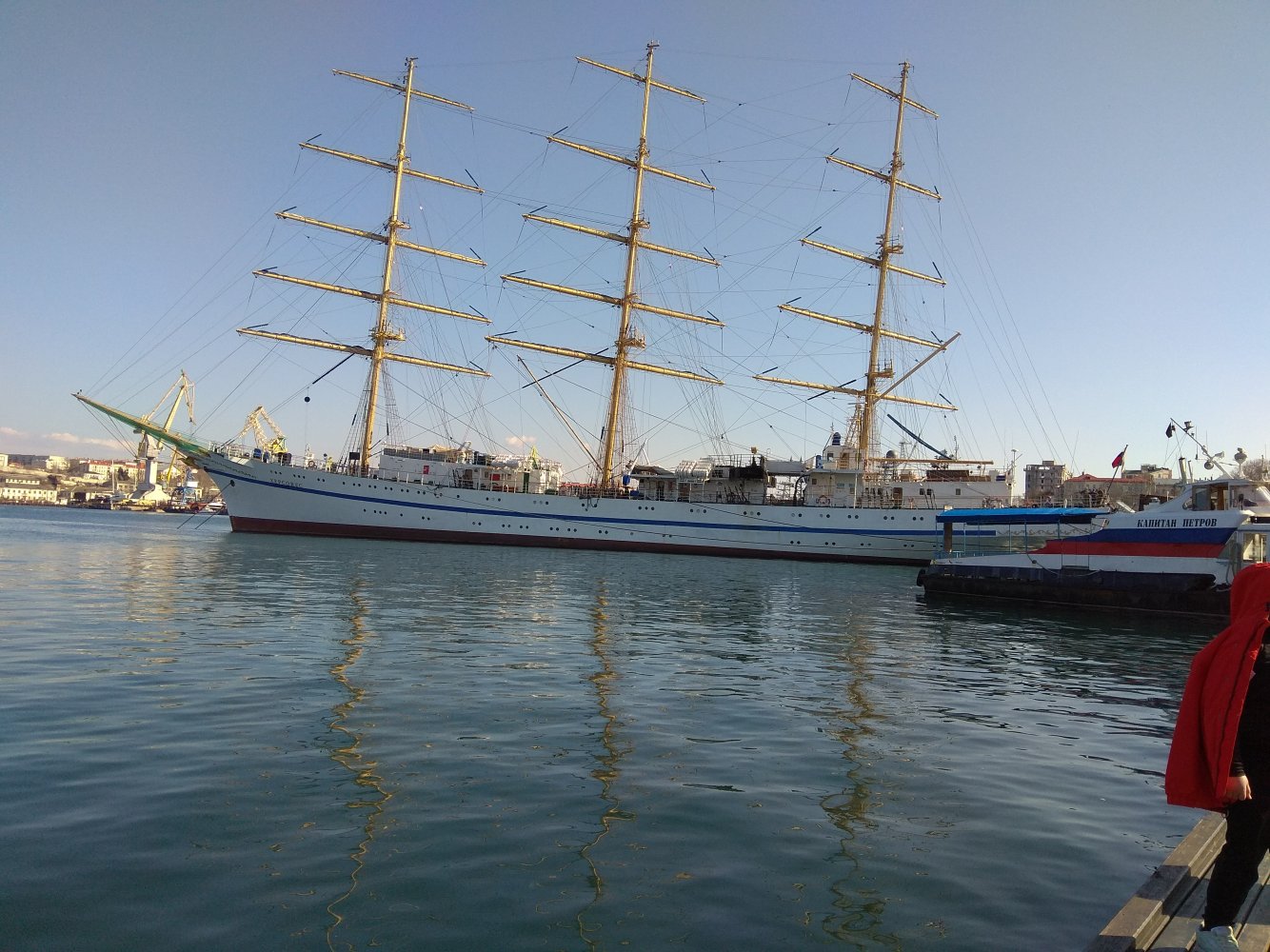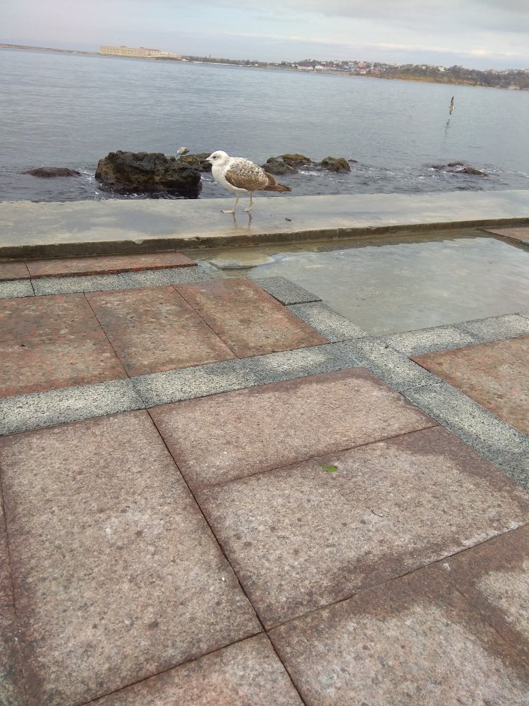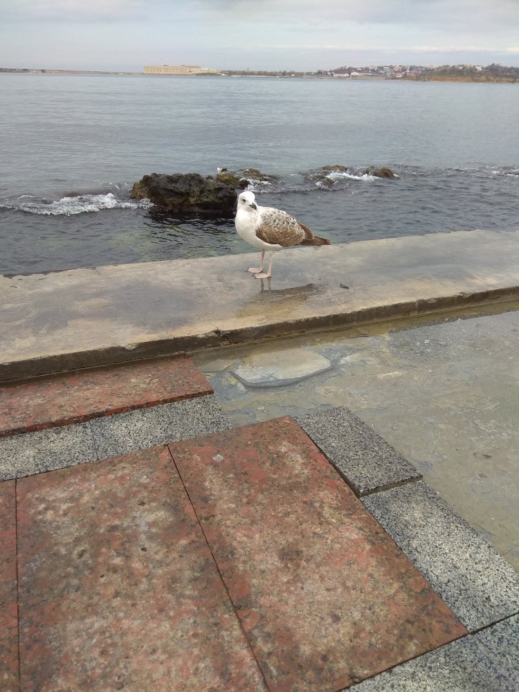 Гуляющая по Приморскому бульвару чайка стала что-то мне "говорить", подошла вторая. Очевидно, им не понравилась фотосессия! Парусник "Херсонес" вышел в открытое море, но, к сожалению, паруса были спущены- штиль!