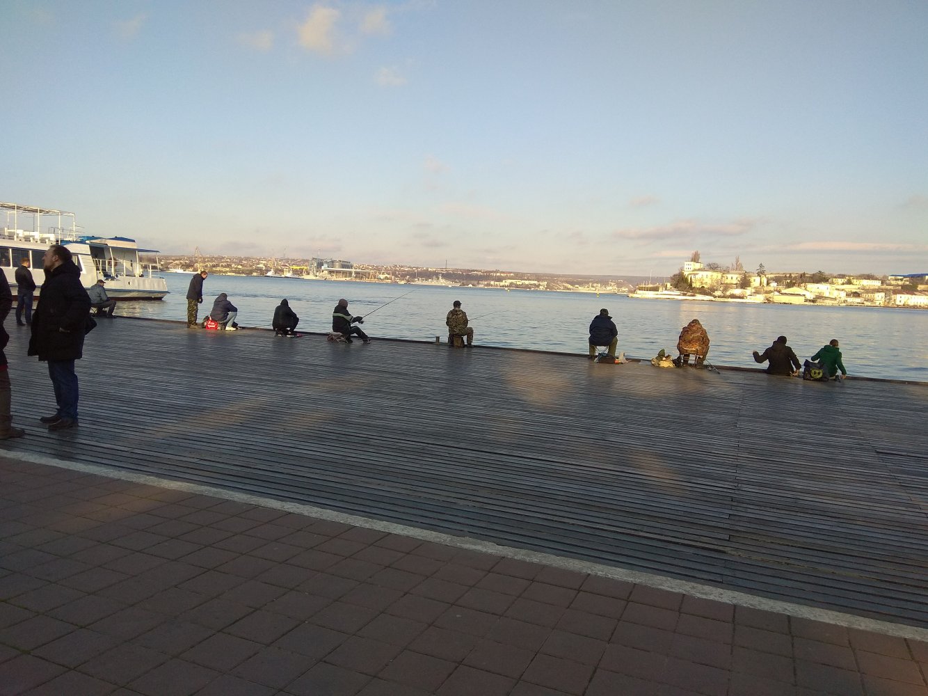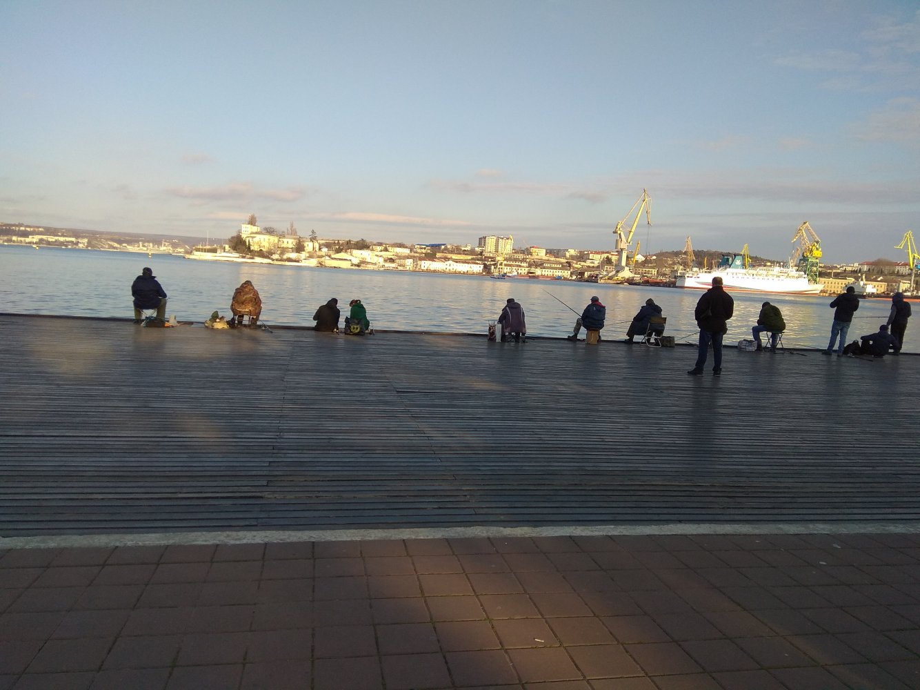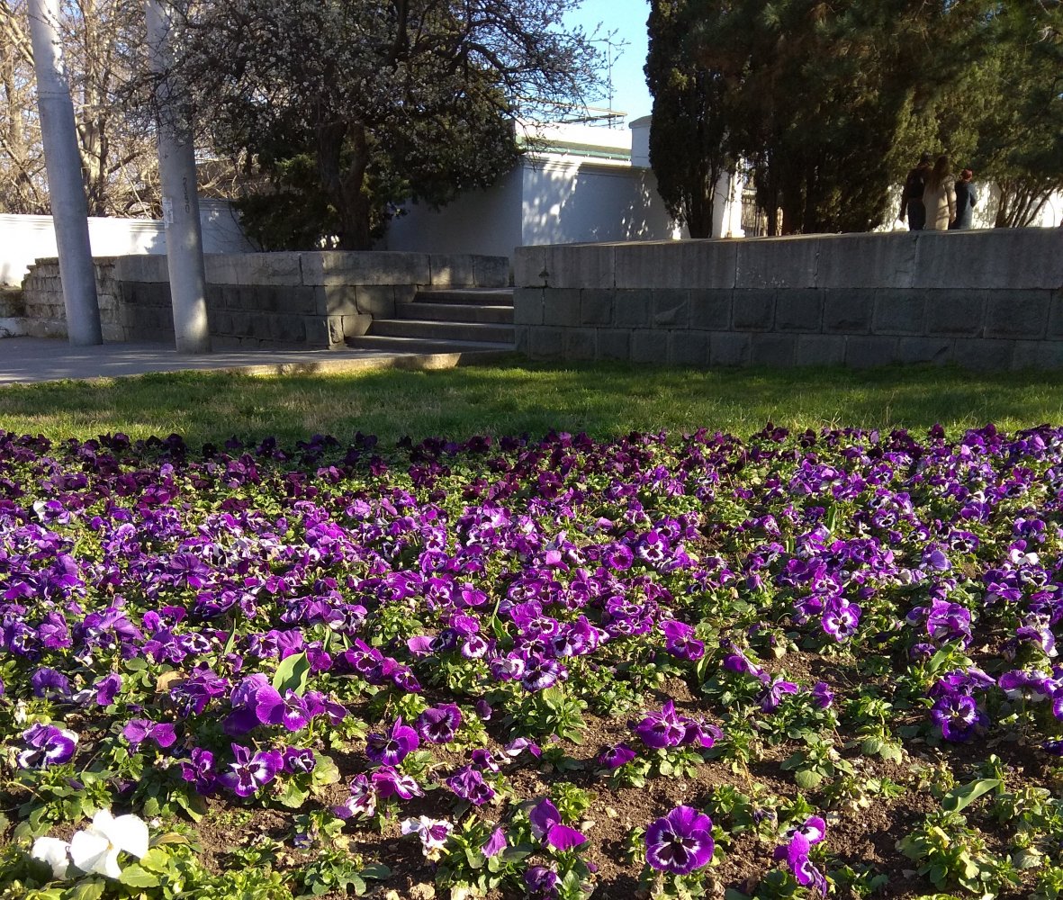 Наконец-то нашла клумбу с моими любимыми Анютиными Глазками! На Графской Пристани не только гуляют отдыхающие, но и обосновались рыбаки,- насчитала больше 20 человек! Но, видно, с рыбой не везет,- только одна кошечка сидела рядом в ожидании лакомства...