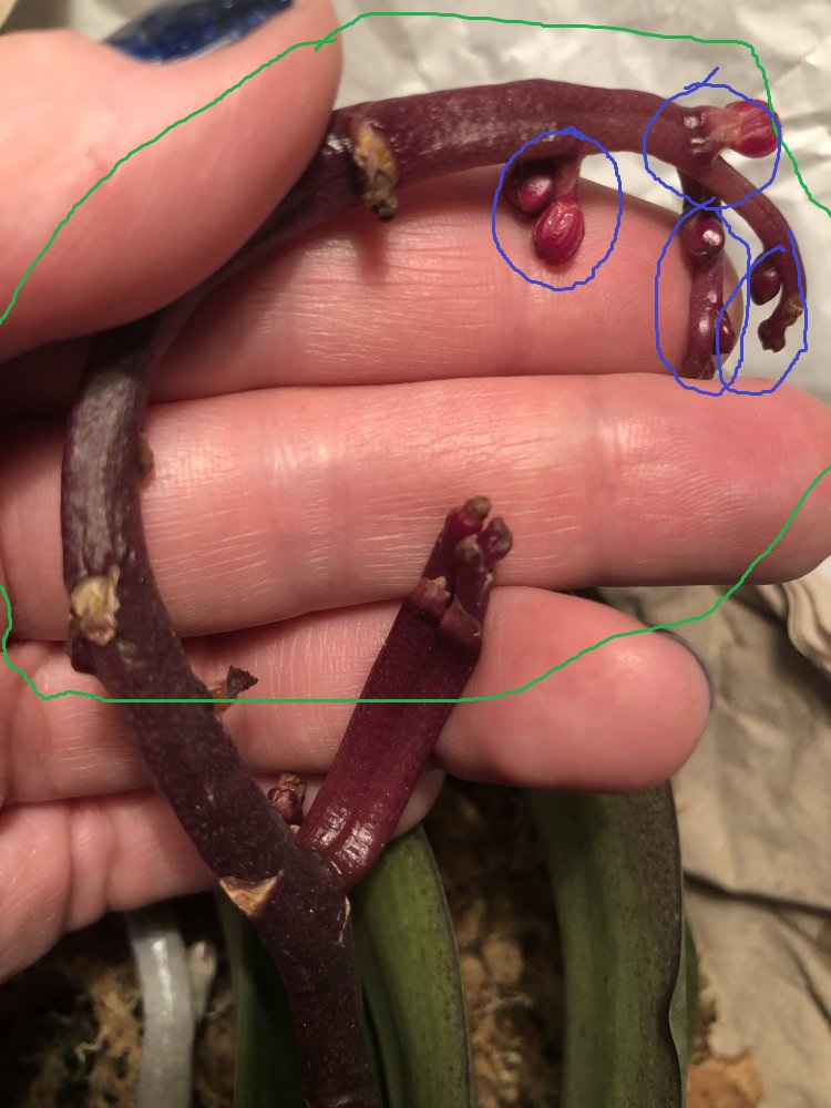 Зелёным я обвела здоровый (не больной, не гнилой) цветонос. А синим - бутоны. Так что, да, вы подтверждаете подозрения, что не отличаете корни от цветоносов.