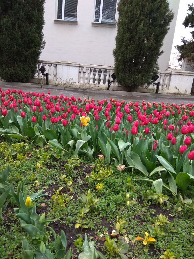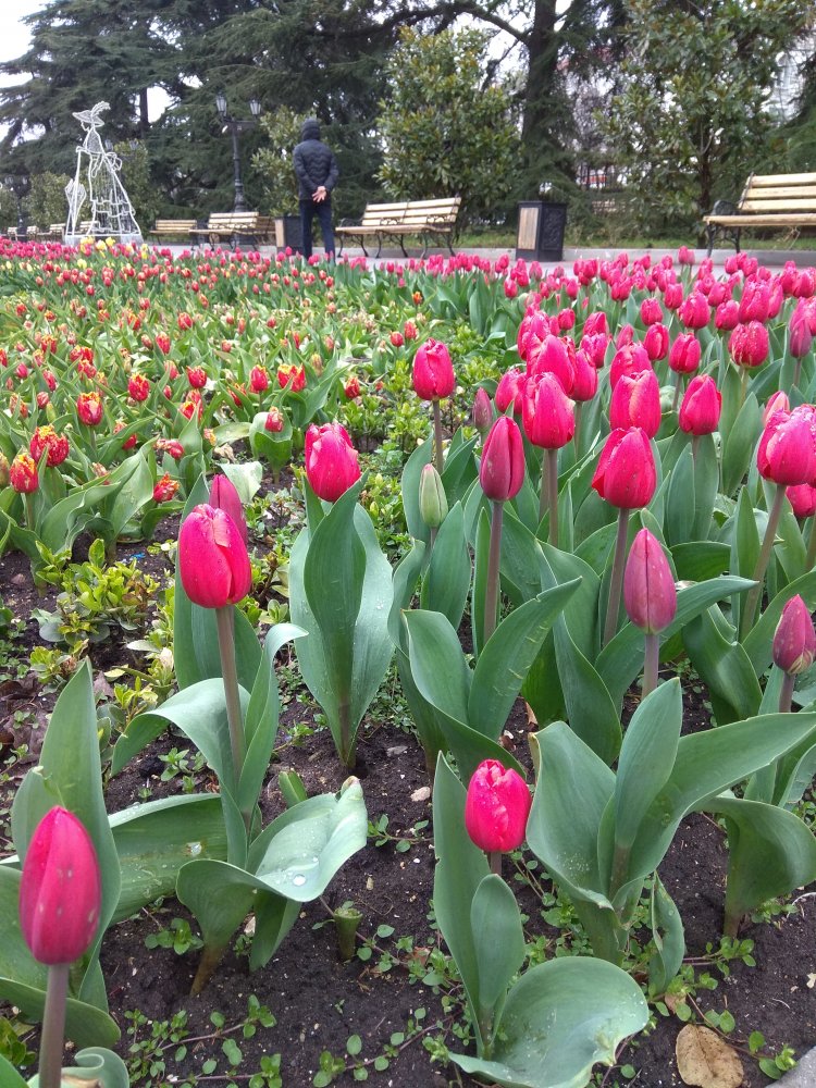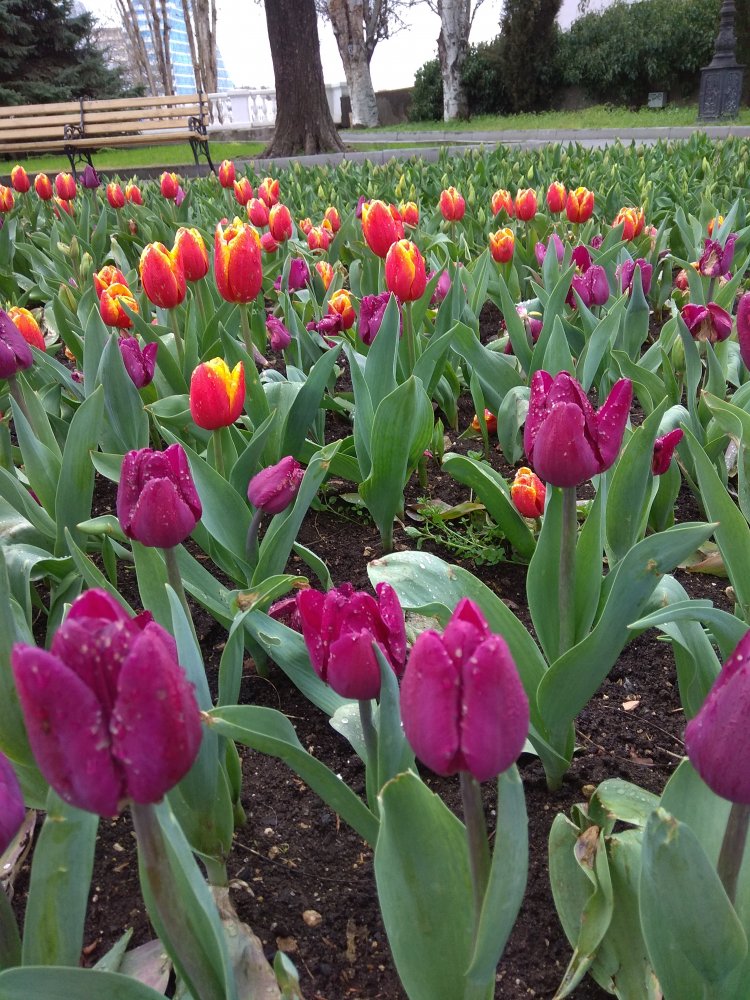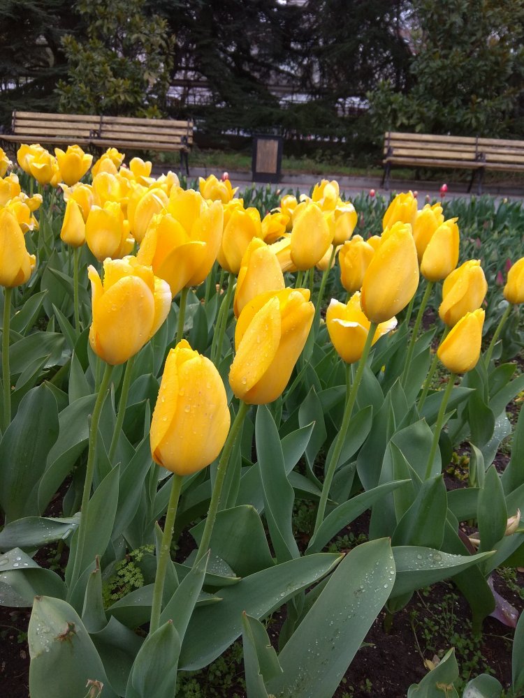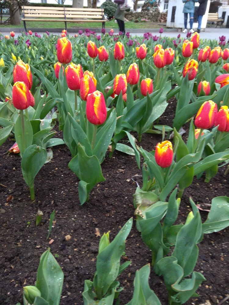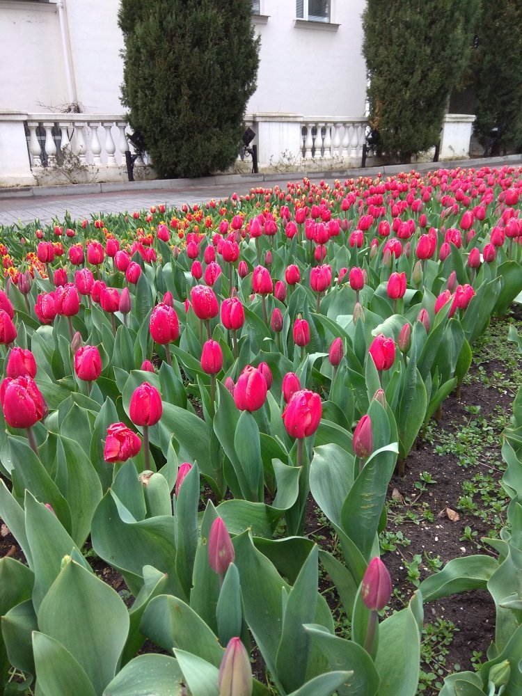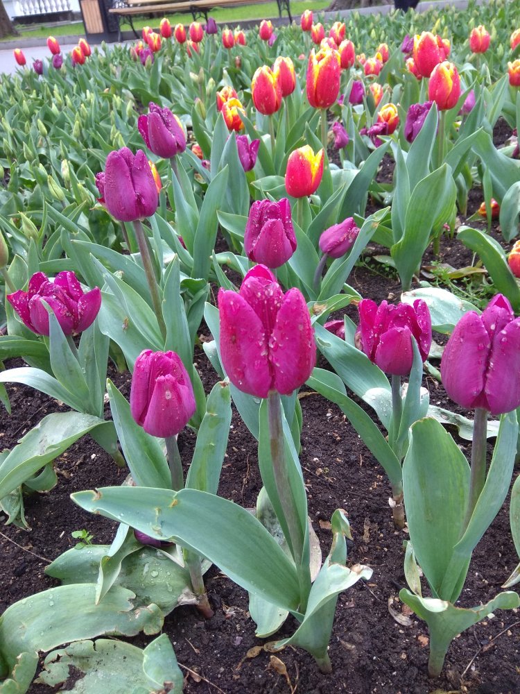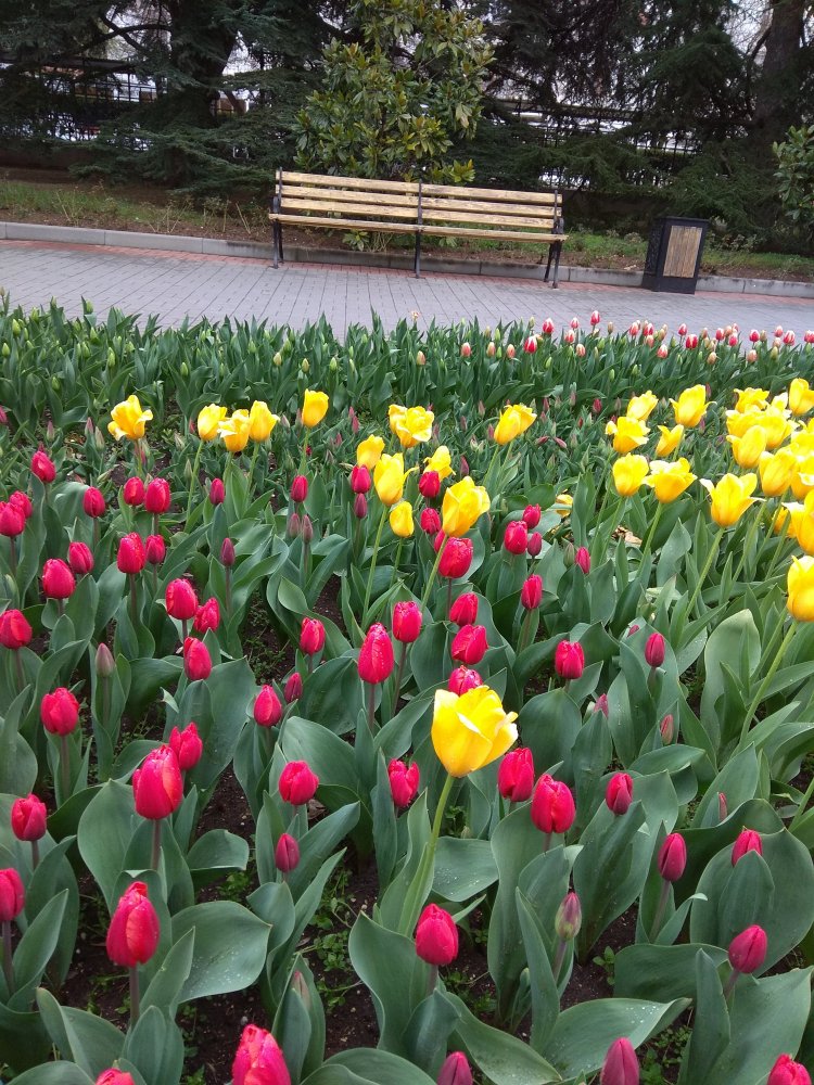 С утра прохладно, но тюльпанам, похоже, эта погода в радость! На клумбах распускаются все новые цветы. Жёлтые тюльпаны высотой не менее 50см! Какие клумбы на Приморском бульваре, какое разнообразие!