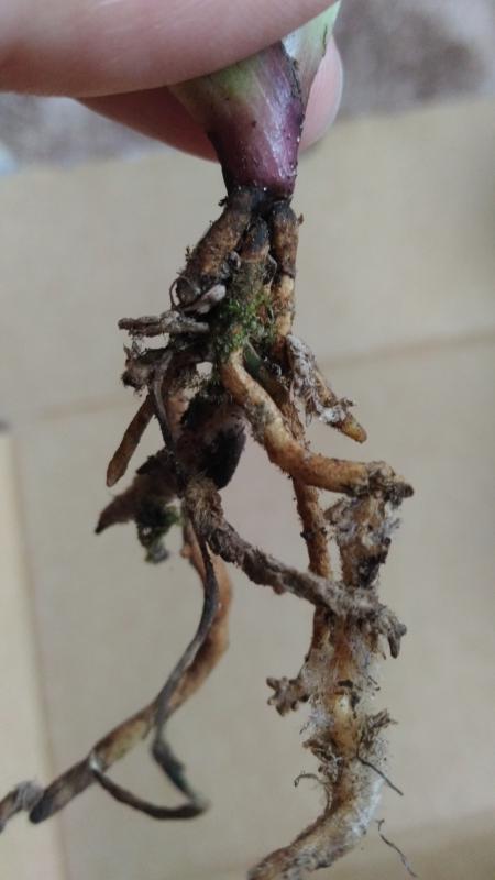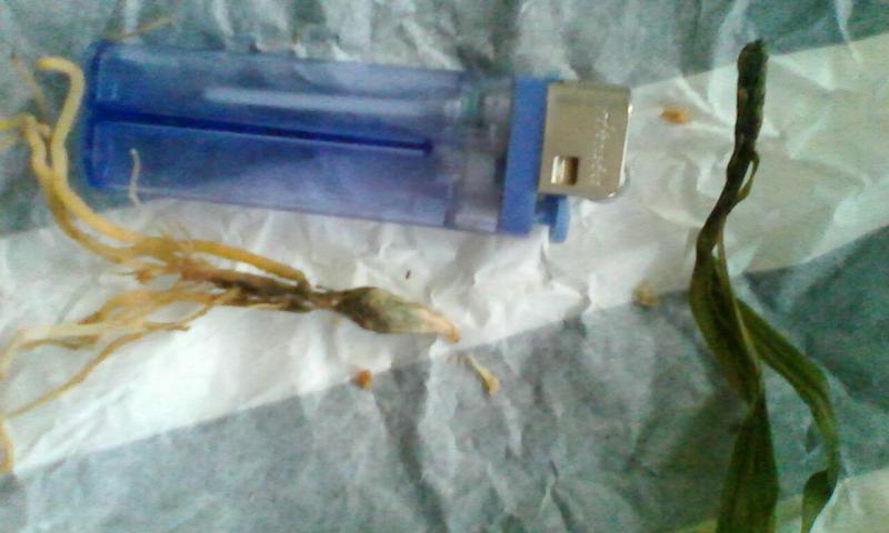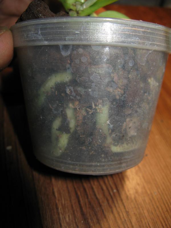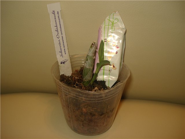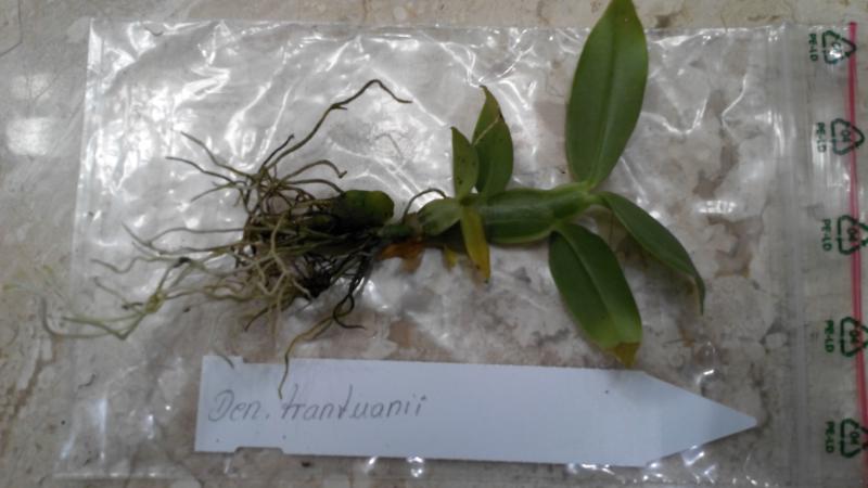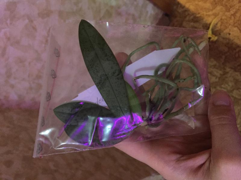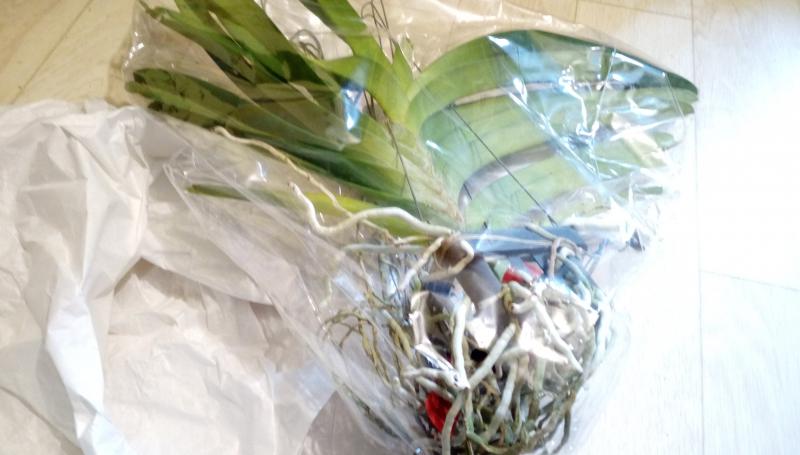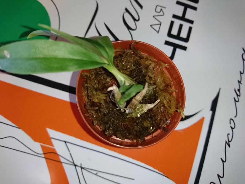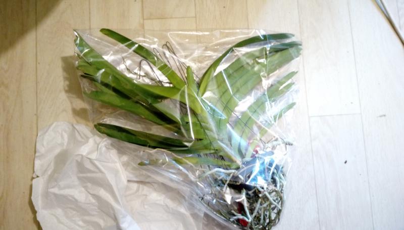 Dendrobium lamyaiae пришло в мокрющем мхе, с горшка почти капало. Мало всего, этот мокрый горшок засунули, видать для надежности, в полиэтиленовый пакет.