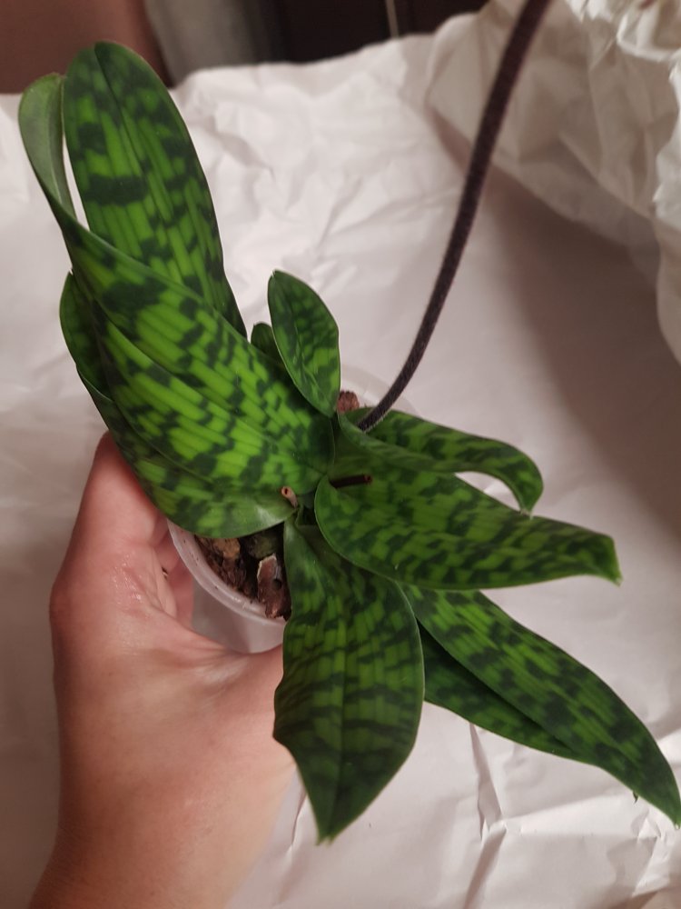 В горшочке три основных орхидейки: одна крупненькая, вторая поменьше и третья малышка. И... ещё одна совсем маленькая и поэтому почти выпала из мха пока ехала, посадила в сободном месте рядом, но вряд ли такая кроха выживет. Это то, что точно удалось разглядеть. В горшочке очень много живых корней. Посадка в меру влажная, горшочек был запакован в полиэтилен. На листьях есть кое-где жёлтые пятнышки, видимо, всё-таки слегка подмёрзли. Выполз маленький паучок.