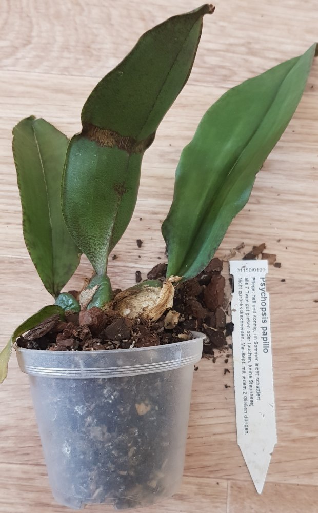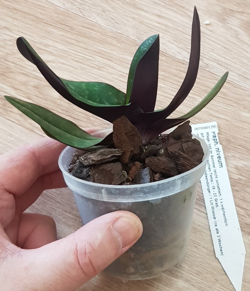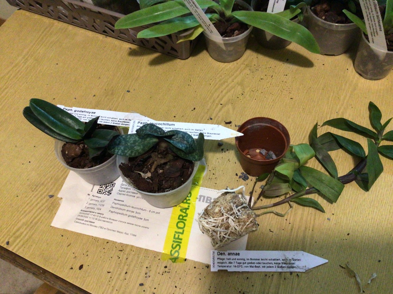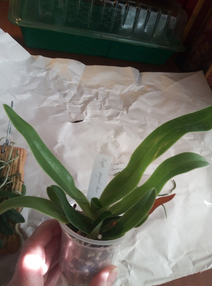 Paphiopedilum godefroyae вместо 3 см пришёл горшок 7 см с замечательным растением. Дендробиум Анны тоже чудесный, в горшочке снизу гравий (для устойчивости?), сверху сухой мох. Транспортировка в целлофановом пакете совсем на нем не сказалась. А вот Paphiopedilum leucochilum немного смущает: в горшке держится некрепко явно на 1 корне и новые листья сильно мельче прежних.