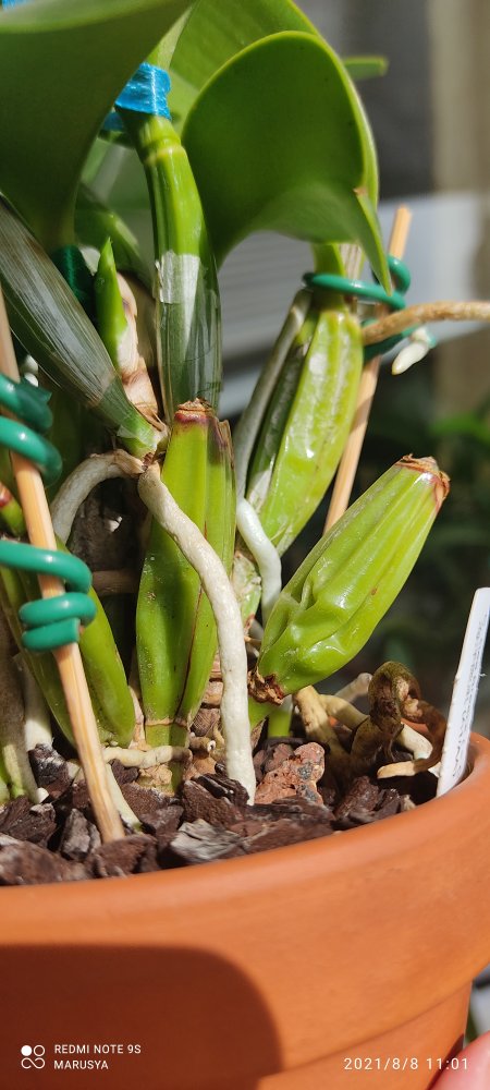 Освежу тему. Я свою получила 6.08.18 из 9 бульб, хорошая, крепкая. Лето 2020 вывезла на дачу, москвичи помнят, май был холодный, а потом то зажарит то зальёт, больше зальёт. Обгорела моя красавица, следы до сих пор видны, поставила под сливу - тля напала, пришлось вернуть домой вместе с другими. 2021г С апреля или мая живёт на северной (северо-северо-восток) лоджии в самом углу, солнце когда есть с 3-4 утра и до 9 час, но нет деревьев и, мне кажется, даже светлей чем на южном окне (там дом рядом загораживает свет). Сидит в глине, поливаю/кормлю, выпустила чехол и растит новый рост и там уже виден маленький кончик. При фотографировинии сильно не крутила, поэтому фотки немного кособокие. Сейчас уже около 17 бульб, две из них двулистные.