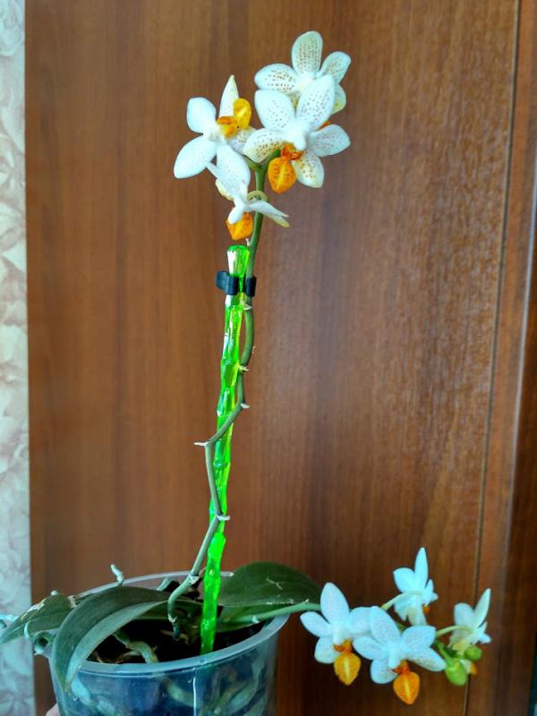 А мой из спецпредложения в 2016 получала, пришел в коре, не пересаживала, очень прям мини, листочки малюсенькие и ни одного больше не выросло за 1,5 года.Корней много, цветет регулярно, немного ароматит, сейчас с одного цветет(доращивает все время, я уже сносила ему нечаянно цветы с бутонами) и второй цветонос ростит.