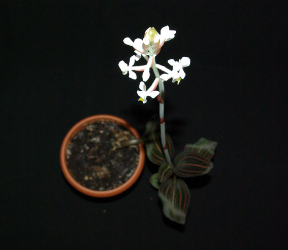 Новые фоты цветущей орхидеи. Помимо цветения, от основания стебля идет новый побег, что видно на одной фотографии.