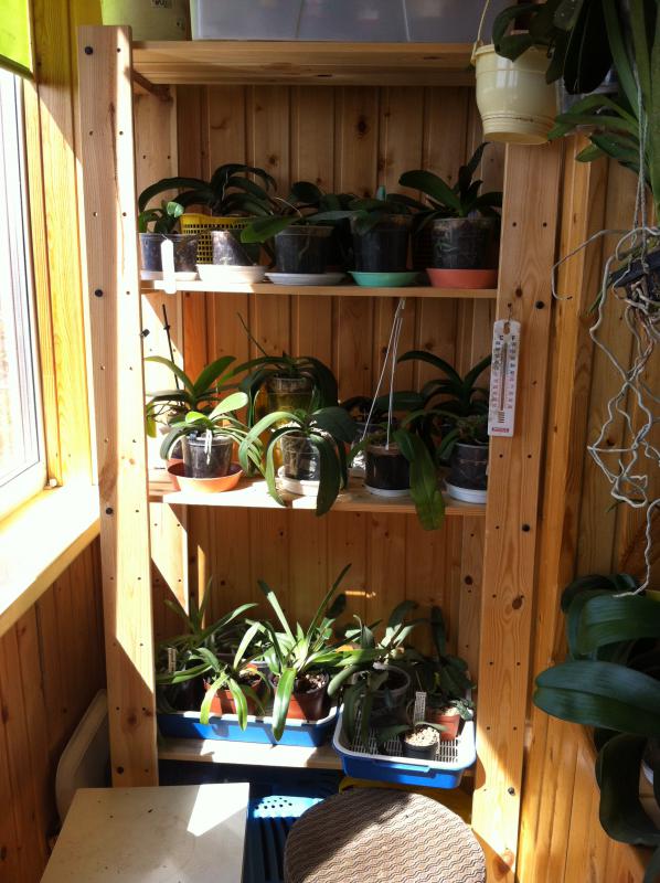 Перестроили немного балкон - вот так мои орхочки пока живут...балкон утеплен, стеклопакеты, планируется подсветка)) ....надеюсь что и зимовать тоже быдкт на балконе....этой зимой при уличной температуре -20, на балконе при всегда открытой двери было + 17-18, а на солнце и все + 25