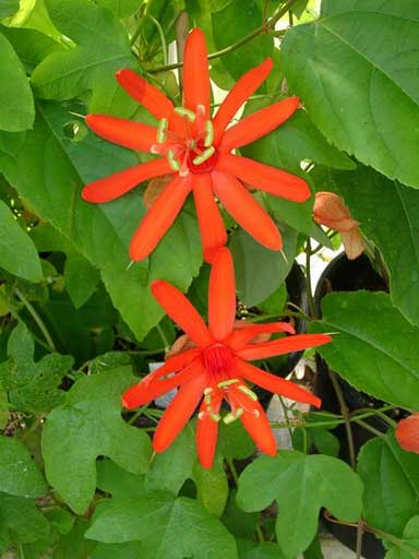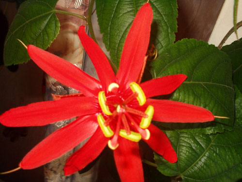 Пассифлора Перси. На фото цветок кажется ярко-красным, на самом деле он красно-оранжевый, огненный.