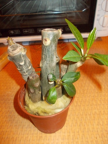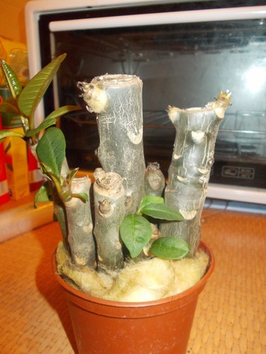Во, короче, результаты эхсперимента. Были зверски замучены обрезаны плюмерии. Смотрела я, смотрела на полуметровых лошадей, которые решили, что того, зима уже и надо листья сбросить. Смотрела как они их сбрасывали, даже смотрела на четыре штуки полуметровых палок в горшке.. Потом смотреть надоело и я их обчекрыжила под корень сантиметров до 10 от корня. На оставшийся пенек привила верхушку с десятком верхних почек, а остальные палки порезала на куски по 15- 20 см и забыла на неделю на окне. Через неделю слегка подсохшие обрубки были подвергнуты обследованию на тему: "Где, черт их дери у них верх, а где низ?". После этого они были собраны в пучок, низ обмотан минватой, слегка смочен, помещен в горшочег, поставлен в полиэтиленовый пакетик и снова забыт на окошке. Сегодня были посажены в индивидуальные горшки, поскольку дали корни. Некоторые особо длинные просятся обполовиниться...