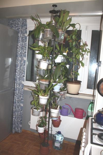 Как рацпредложение могу предложить две параллельных рядом установленных вертикальных стойки для цветов. Они высотой от 2,7 до 3 м - высота регулируется при креплении. Польского или нашего отечественного производства. Стоят до 1000 р за штуку. На каждую стойку можно расположить 10-12 горшков, можно еще добавить огородные держатели для клубники в качестве дополнительных кронштейников. На такую конструкцию я еще закрепляю гигрометр-психрометр и сверху яркую лампу 150 ватт. Всего помещается порядка 33-35 горшочков диаметром 15-18 см, пластиковых или керамических. Рациональное использование - на кухне. Стоит она у меня у окна.