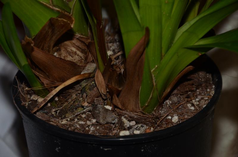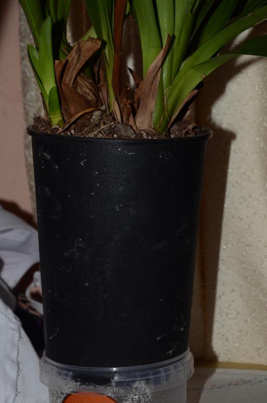 Пшикаю я вообще редко, обычно мокрым бельем влажность поднимаю, а посуду взяла стандарнтый высокий горшок для цимбидиума. Потому что мочалка в меньший не влазила, а обрезанный он такой же по габаритам сверху что и не обрезанный, был, высокий и наваливал любой, а палка чтоб держалась в чем-то.. Не поливаю, смачиваю донышко - субстрат в целом слегка очень слегка влажный. Но судя по тому что бульбы так сдулись - корни нерабочие.