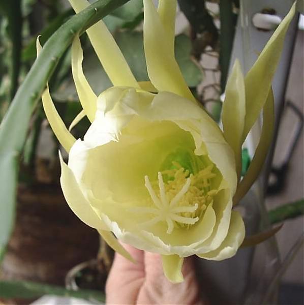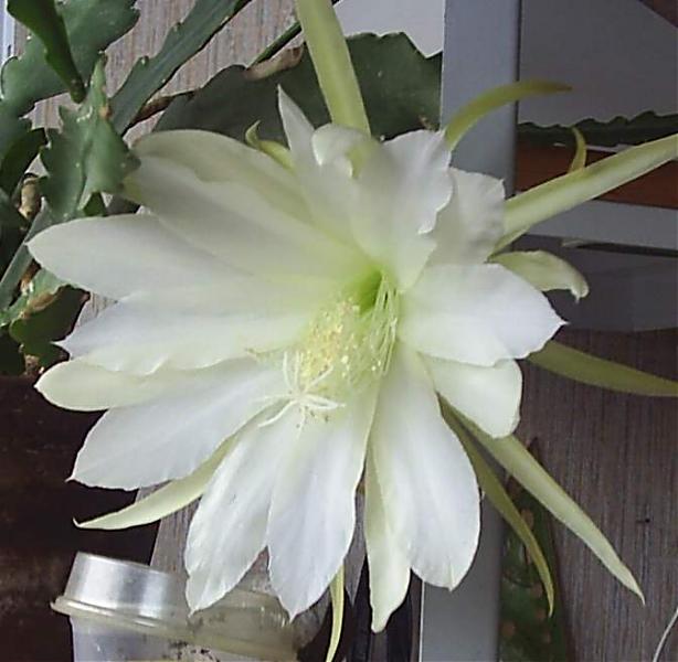 Вот зацветает у меня такой кактус. По зелени - стопроцентный эпифиллум, с довольно широкими и длинными темно-зелеными стеблями. Цветок желтовато-белый, длиной по диагонали 21см от основания завязи до краев лепестков, без запаха. Растение крупное. Воздушных корней на стеблях почти нет. Многие стебли дома растут круглыми в основании и почти по всей длине, хотя света много.
