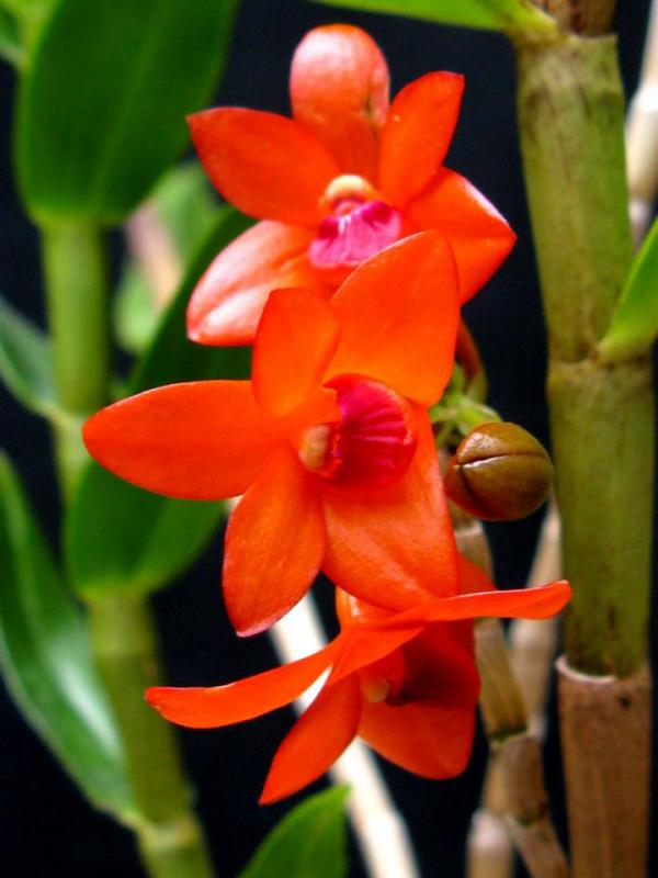 Dendrobium mohlianum В природе Dendrobium mohlianum встречается в Индонезии, Папуа-Новая Гвинея и близ прилежащих островах, где произрастает на высоте от 450 до 3.100 м над уровнем моря. Растение симподиальное [подробнее о типах роста орхидей ...], состоящее из псевдобульб, растущих очень плотно друг к дружке. Псевдобульбы размером около 40 см длиной и 1-1,2 см шириной, молодые могут быть более толстенькие на кончике. Листья ланцетные, средне-зелёного цвета, размером 8-9 см длиной и около 3 см шириной, держатся не более 18 месяцев. Цветоносы появляются на уже безлистных псевдобульбах в верхней трети и несут в себе 1-3 цветка, крайне редко более. Цветы красно-оранжевые с более тёмной губой, размером 2-3 см в диаметре.