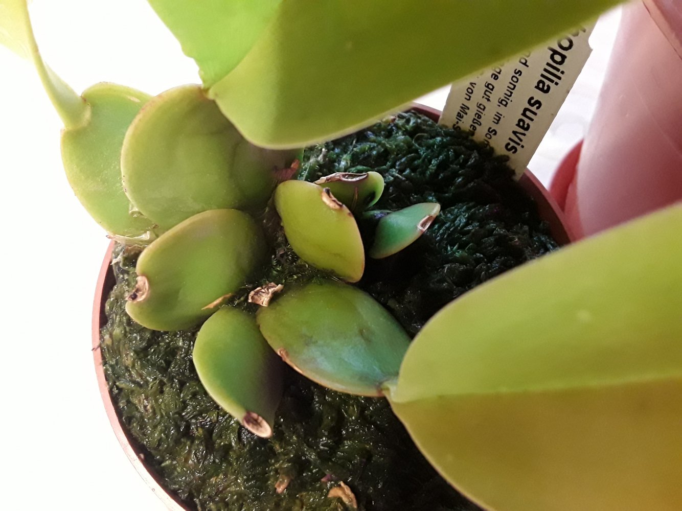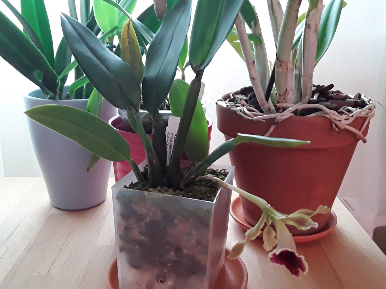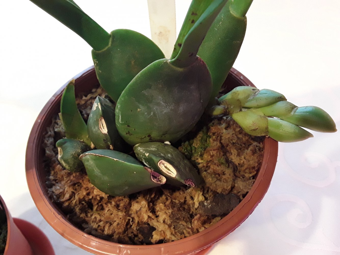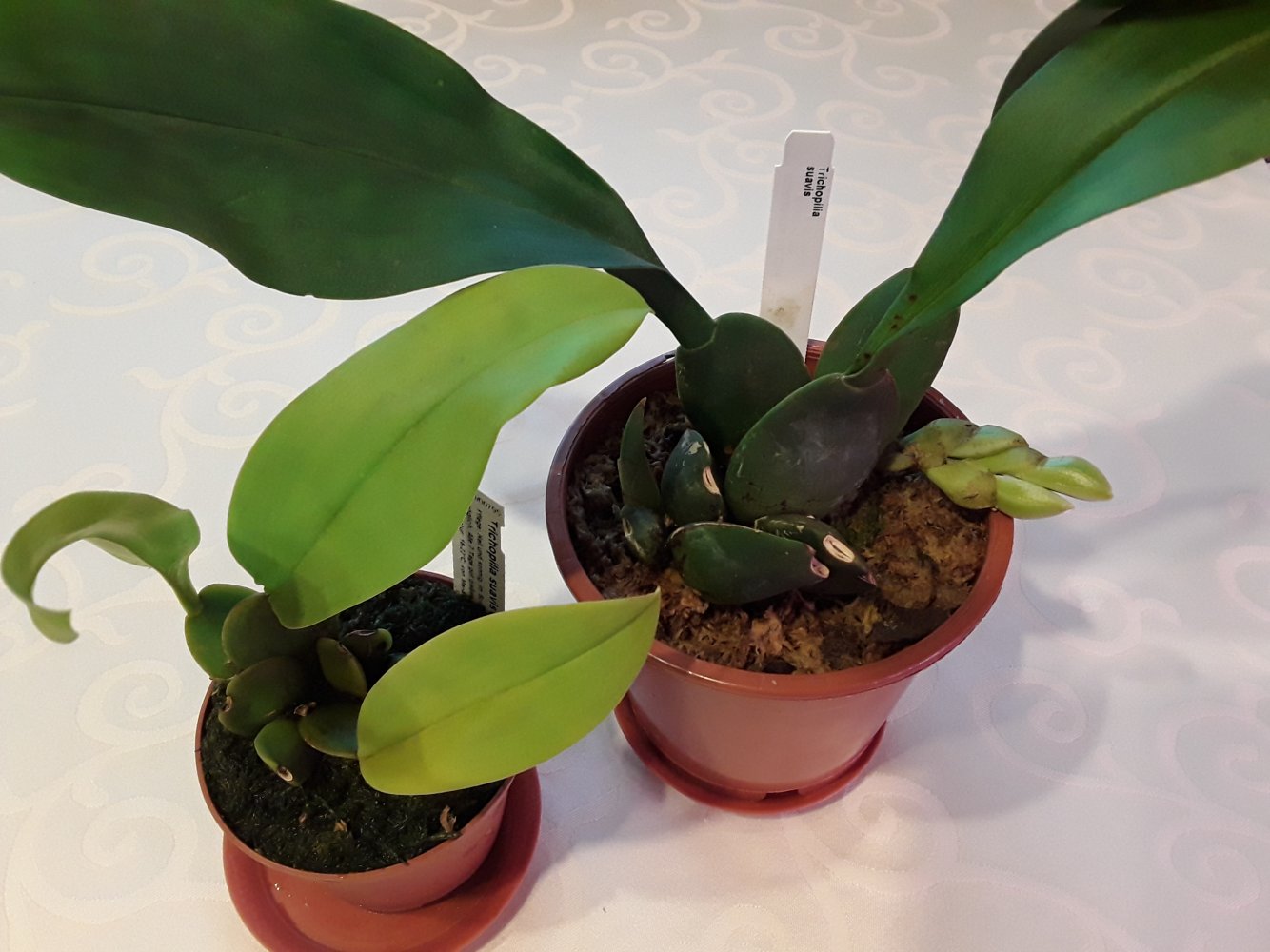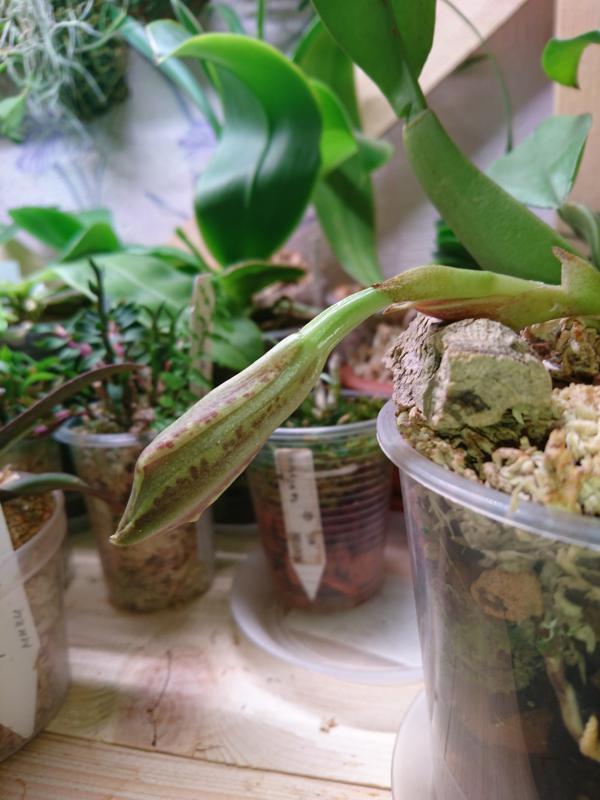 Оживлю темку, а то что то мало кто выращивает эти замечательные орхидеи и делится опытом)). Моей давнишней мечтой была Trichopilia suavis. Сначала купила на другом ресурсе в 2015 г сеянец от Швертера - промучилась с ним, погиб. После уже на Пассифлоре заказывала от него же, но то заказ не подтверждали, то сильно сопревший малыш приходил. В итоге удалось получить более менее живого малыша (хотя тоже проблемного) ближе к 2018 году. Выжил и стал расти, но с учетом его размера и скорости роста решила, что цветение такими темпами увижу не раньше, чем лет через 10... Поэтому заказала взрослую в Эквагенере и весной 2019 года получила. Кстати, вместе с еще одной взрослой трихопилией - маргината. Размер, конечно, был отличный, огромные растения. Но как всегда с этим поставщиком, очень большая часть обеих трихопилий сопрела в дороге. Пришлось сильно порезать растения. Но они обе выжили и адаптировались. Маргината цвела в прошлом году, в этом только растет. Кстати, покажу ее фото, что то у меня закрались еще тогда сомнения, что это не маргината, а тортилис. Суавис сажала после получения вместе с остатками старых корней, по большей части мертвыми, двумя деленками вместе. Поэтому недавно решила пересадить ее в новый субстрат и горшок, чтобы в зиму она с гнилыми корнями не уходила. На тот момент у нее было 2 роста (как я думала). При пересадке поняла, что все "мертвые" старые корни совершенно живые! Поэтому не стала ничего отрезать, а просто пересадила в больший горшок. А спустя несколько дней стала замечать, что один рост какой то странный - округлая верхушка на тонкой ножке. Боялась даже помыслить, что это цветонос... но теперь уже очевидно, что это именно он! Для сравнения, фото 2 трихопиллий - от Швертера, которую уже около 3 лет ращу и от Эквагенеры.