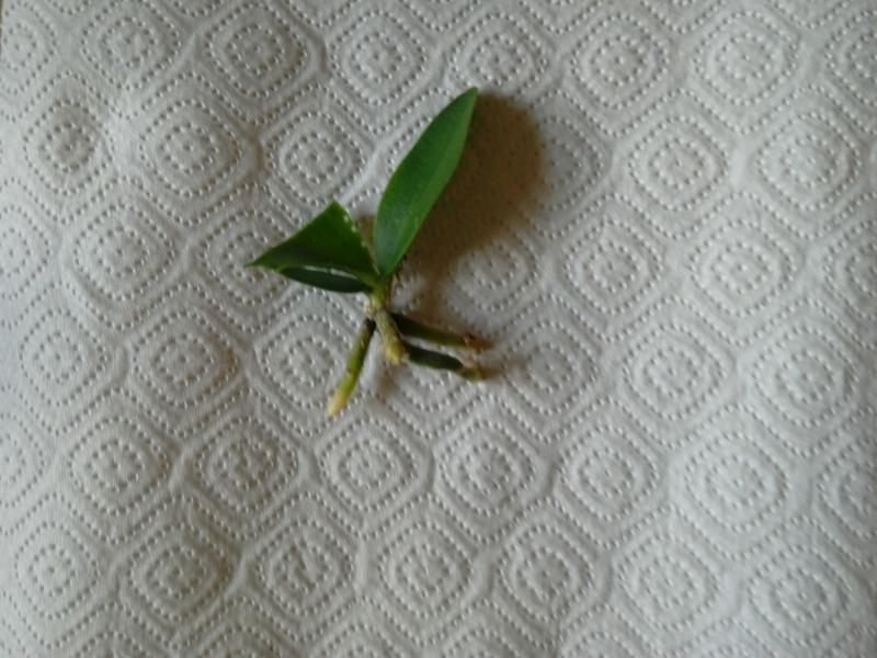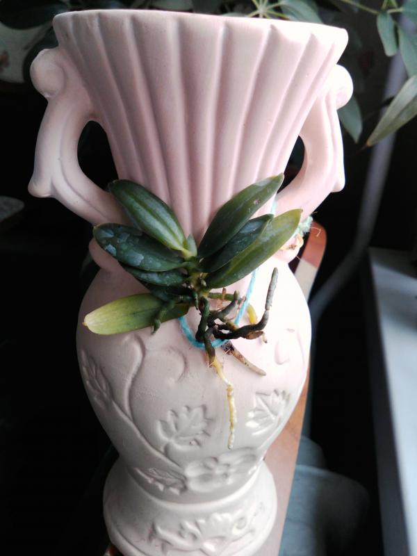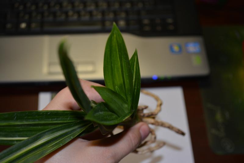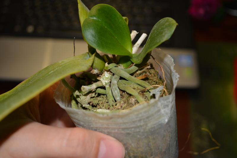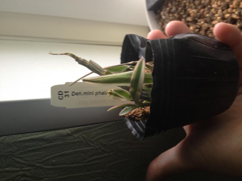 1) Den. mini phalaenopsis 'variegated leaf'. Пришел во мху. Мхом были заложены даже бульбы. Мох был слегка влажный. Здоровых корней осталость только 3 шт. от нового роста.