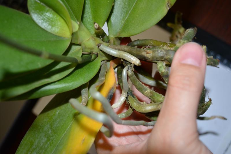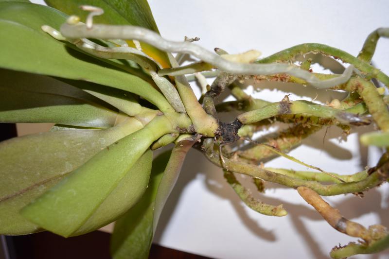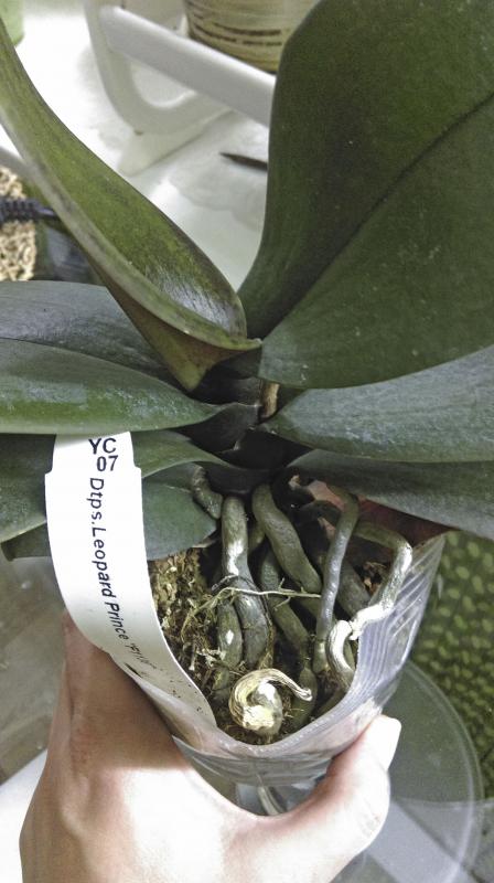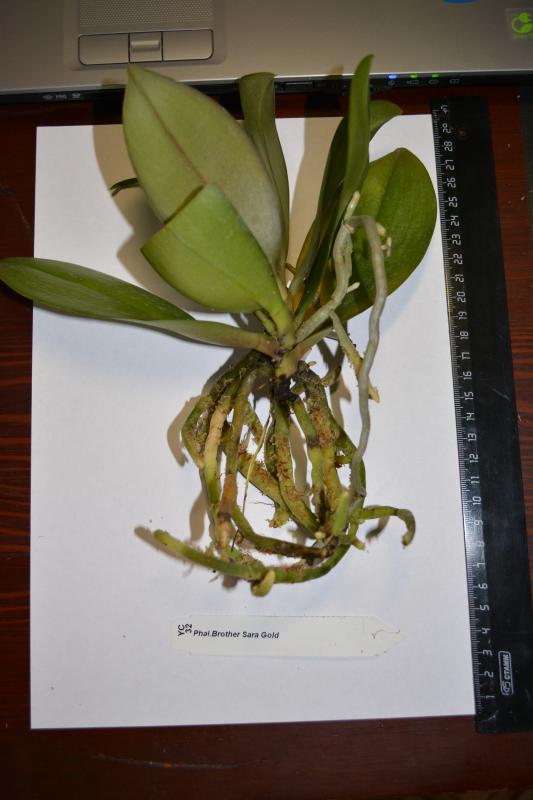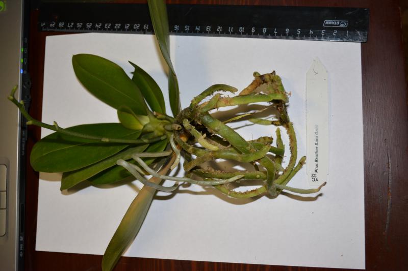 4) Phal.Brother Sara Gold. Пришёл во мху, мох влажный. Беспокоит черная попа. Нижний лист желтый, следующий за ним лист отваливается и там чернота. Корни в целом хорошие.