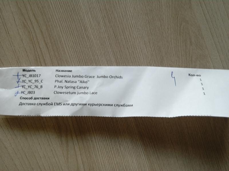 Заказ 60462, забрал в Москве 25.03. В заказе 5 позиций, из них 3 каттлеи - на это раз превосходного качества, не чета зимниму привозу: все в горшках, до 6 псевдобульб, много живых корней! Den thyrsiflorum - тоже великолепный. Огорчила только laeliya tenebrosa "nicci' - три полу засохшие былинки с такими же корнями, но с учетом весны, дкмаю выживет. В общем, в этот раз твердая 4 из 5 за заказ - приятно удивлен! :)