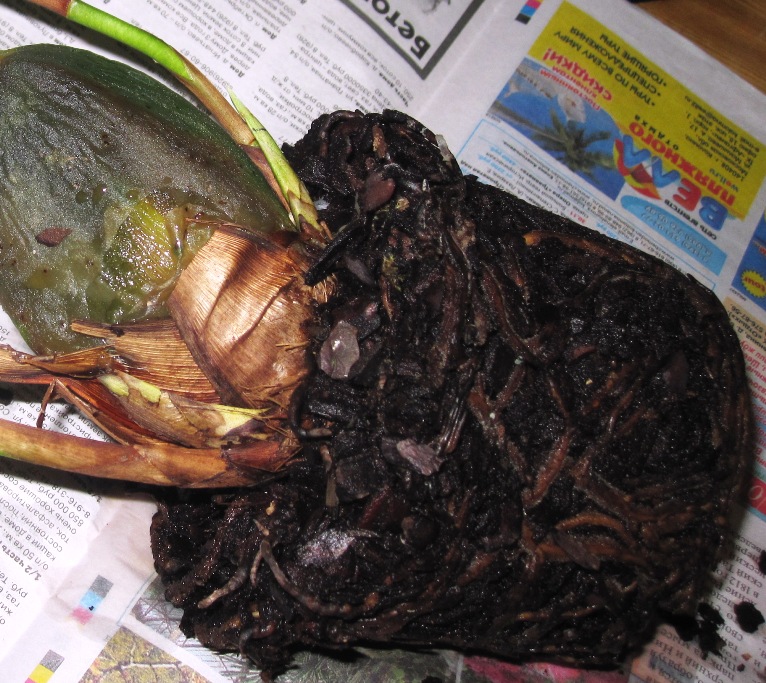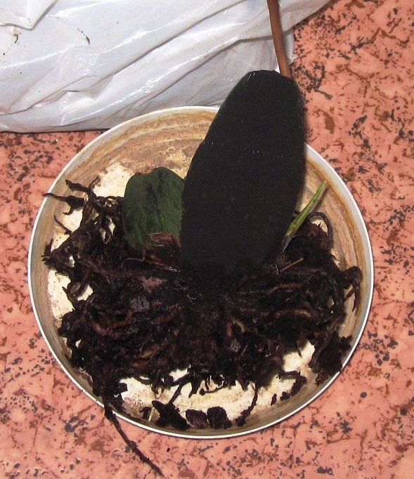 Операция начата немедленно. Лику вынимаем из горшка. Один из цветоносов пришлось срезать. Под пальцем омерзитеьная слизь...