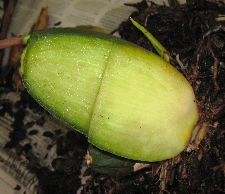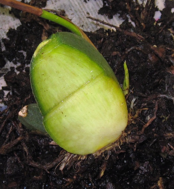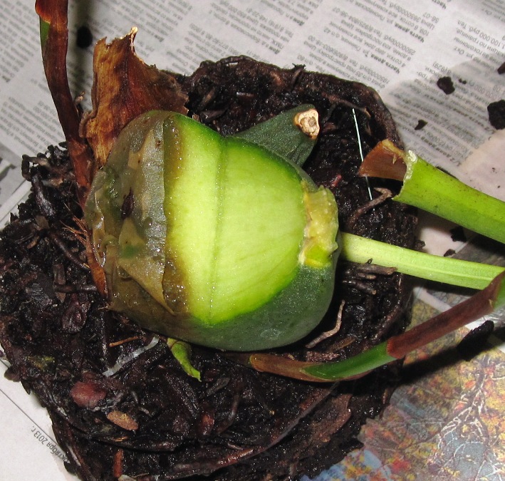 Обратите внимание - левый рост на фото уже гибнет, правый, с (ещё) зелёной части бульбы, жив. Не смотрел внимательно, но вроде бы в пятницу было всё в порядке... DS: бактериальная гниль, грибковая так быстро не развивается.