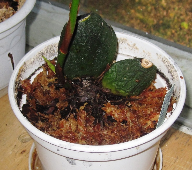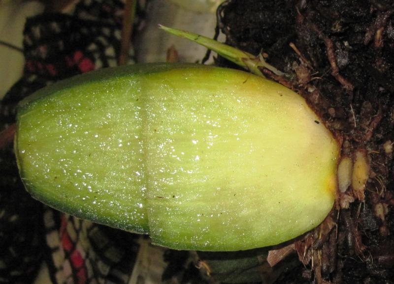 Субстрат - кора и немного земли для азалий (ложка). Поливаю в среднем 1,5 раза в неделю с добавление эстракта конского навоза (Флумб). Это так вырос новый рост который по приходу совсем молоденький. Периодически вылезают новые корешки (на фото видны 2 шт. если увеличить). Беспокоит то, что у нее не надувается молодая Бульба и сильно сморщились старые. И одна старая Бульба снизу начала чернеть (но пятно не мягкое). Все ли с ней хорошо? У меня пока первая ликаста.