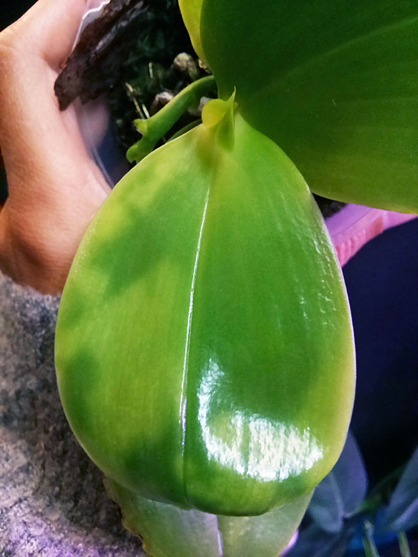 За время моего отсутствия в течение месяца один из недавно полученных фаленопсисов отрастил вот такой лист с неоднородной окраской: