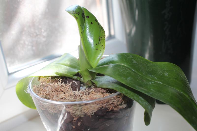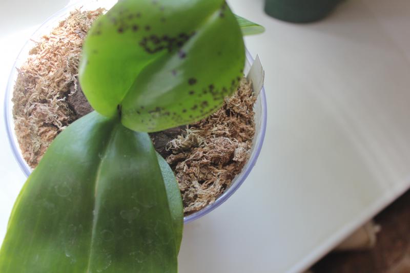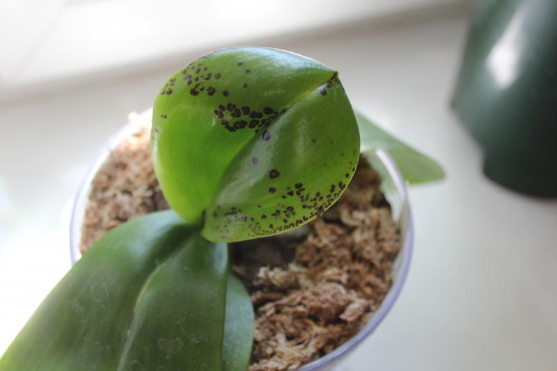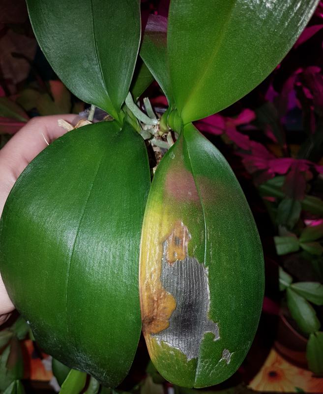 Вот этот ожог фаленопсис получил ровно год назад всего за 1 день. Пятна были более вдавленные, немного выровнялись. К тому моменту это был верхний лист, теперь уже в середине.