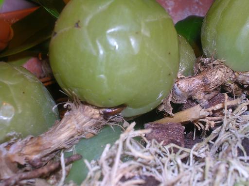 Куплена 5 дней назад. Корней нет, что не удивительно учитывая субстрат в котором она находилась: двухсантиметровый слой коры на дне, оставшийся объем горшка заполнен ажурным гнездом из кокосового волокна, как раз в таком "гнезде" у меня ванда растет. Из плюсов, полтора новых роста.