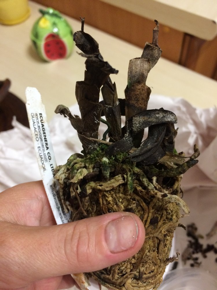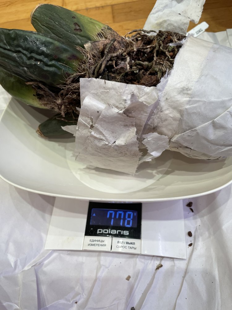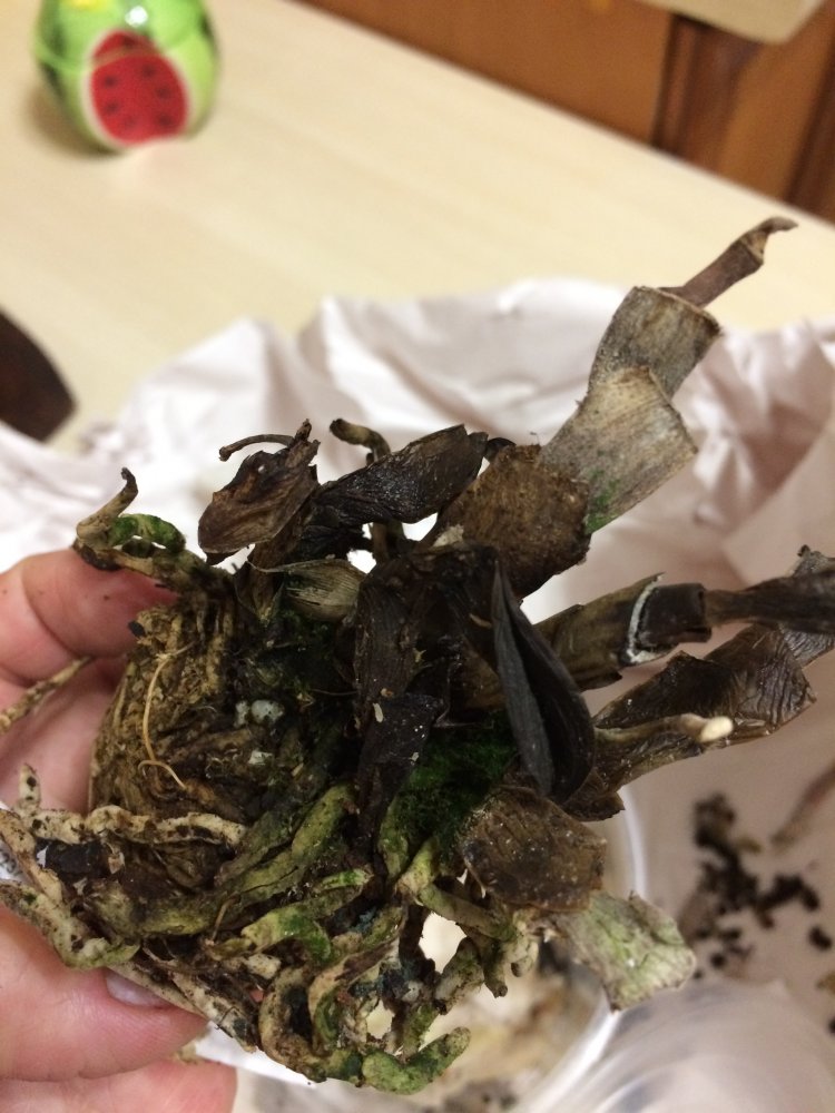 Жирненькие бульбы, вопрос к одной, там пятно. Наметился рост, но сопрел. К корням вопросы - есть ли живые. В целом довольна.